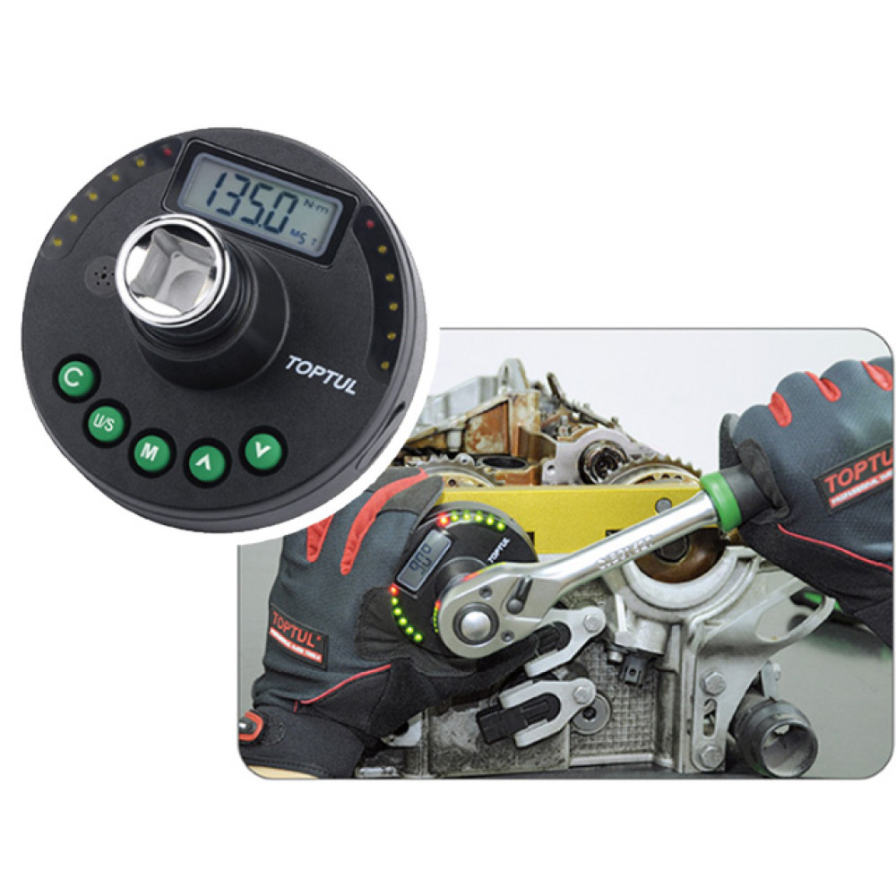 Цифровой динамометрический адаптер TOPTUL DTA-340A 1/2" 17-340Nm. Адаптер предназначен для измерения усилия, с которым закручивается колесо автомобиля. Используется вместе с трещоткой или воротком под присоединительный квадрат 1/2".