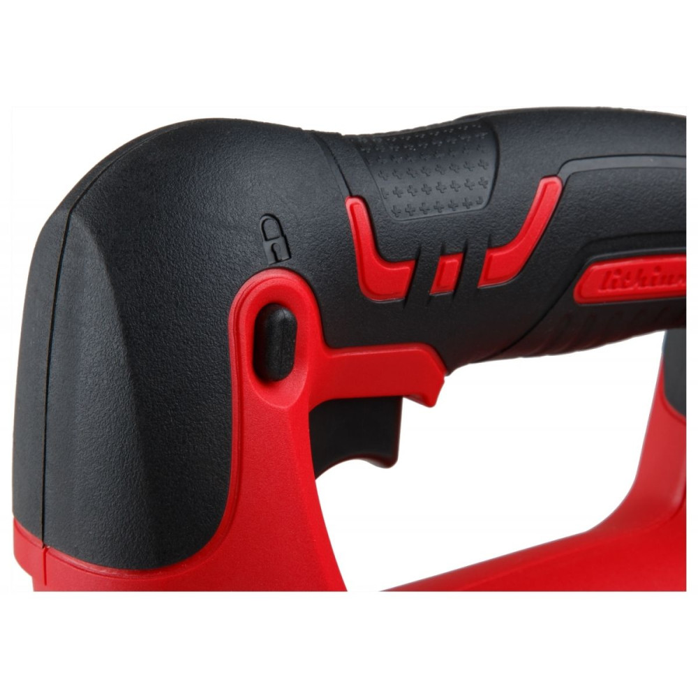 Лобзик оснащен удобной, эргономичной рукояткой, отличается пониженным уровнем вибрации, возможностью использования в местах без электроснабжения. Наличие маятникового движения с направляющим роликом позволяет производить быстрые и при этом ровные пропилы. Возможно подключение пылесоса. Регулировка скорости позволяет использовать лобзик для реза различных материалов.