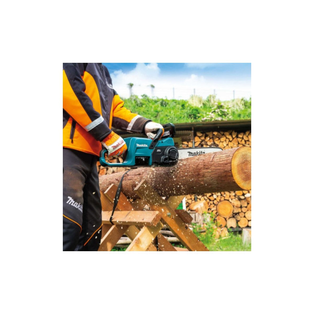 легкая и компактная аккумуляторная цепная пила, обладающая высокоэффективным бесщеточным двигателем с редуктором и низким уровнем шума для максимально комфортной работы. Пригодится как профессиональным садоводам, так и бытовым пользователям, которым компактность и легкость инструмента для продолжительного времени важнее его мощности. Хотя мощности данной пилы достаточно, чтобы свободно резать бревна диаметром до 25-30 см. За счет редуктора скорость цепи уменьшена до 7.7 м/с, но крутящий момент значительно увеличен. Пила работает от одного универсального LXT аккумулятора с напряжением 18 В.