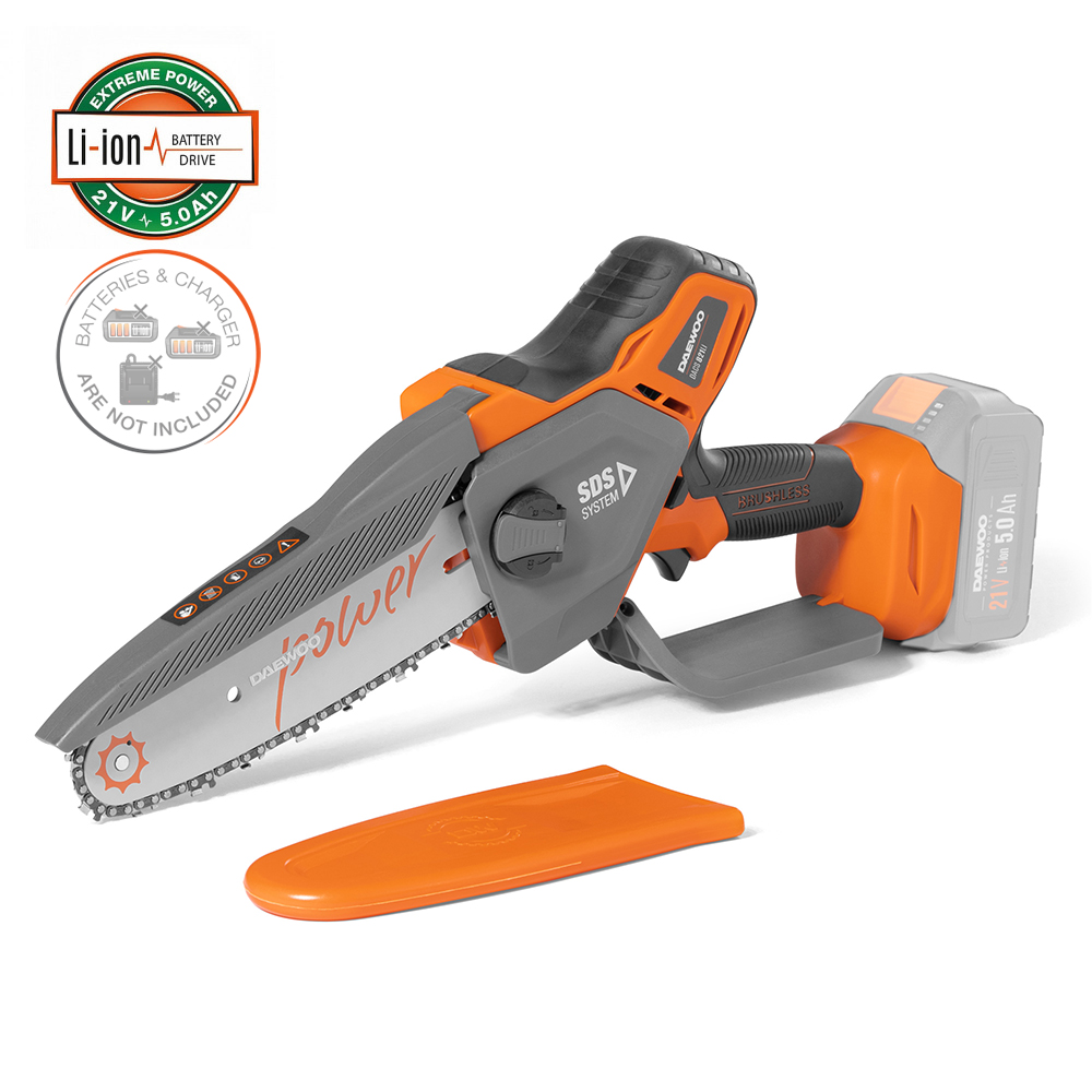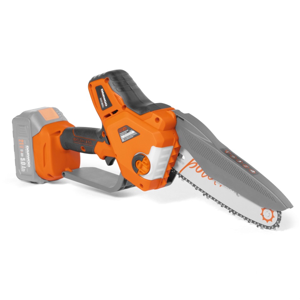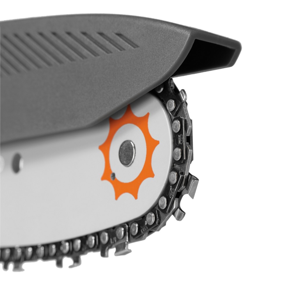- Надежная пильная цепь и шина. Двухсторонняя шина длиной 20 см и цепь с 48 звеньями и шагом 1/4” обеспечивают быстрый и чистый рез сухого и свежего дерева.