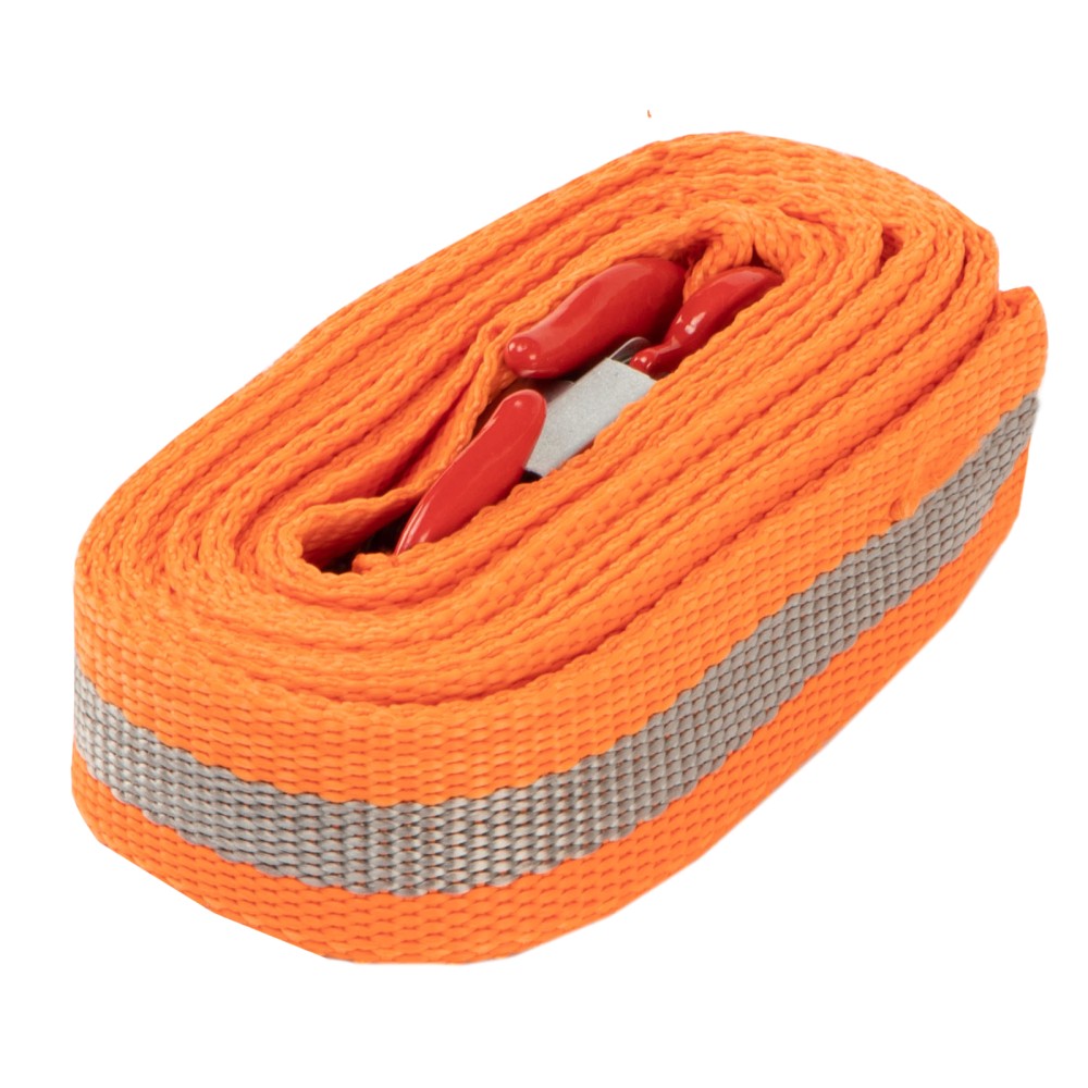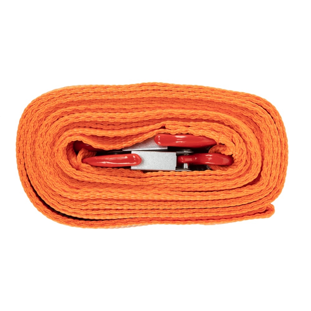 Трос буксировочный Stels 54375 с 2 крюками, в пакете, выдерживает нагрузки до 5 тонн. Будет полезен водителям при поломке легковых автомобилей, проблемах с двигателем, вытягивании транспортного средства из кювета, грязи и т.д.ПреимуществаНадежность — морозоустойчивый авиационный капрон не разрушается от резких перепадах температур и влажности, обладает высокой стойкостью к износу и не растягивается в процессе эксплуатации.Удобная эксплуатация — два крюка позволяют легко зацепить трос, а также сделать дополнительную петлю.Безопасная буксировка — 5-метровый трос удерживает авто на оптимальном расстоянии, а благодаря оранжевому цвету он хорошо заметен на дороге.Компактность — ленточный плоский трос весом 415 г легко скручивается в рулон и помещается в багажнике.Гарантированное качество — изделие соответствует требованиям ПДД и основным положениям допуска ТС к эксплуатации.Удобная транспортировка и хранение — трос поставляется в индивидуальной упаковке.