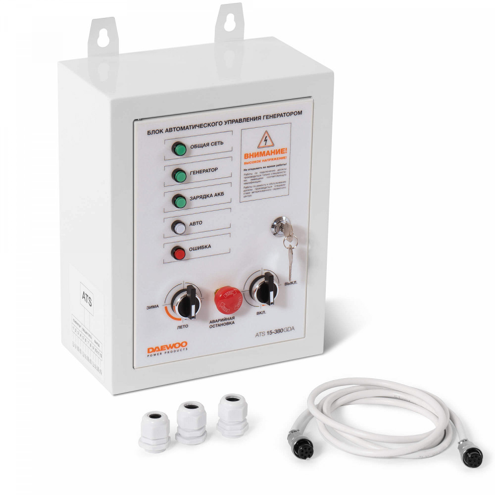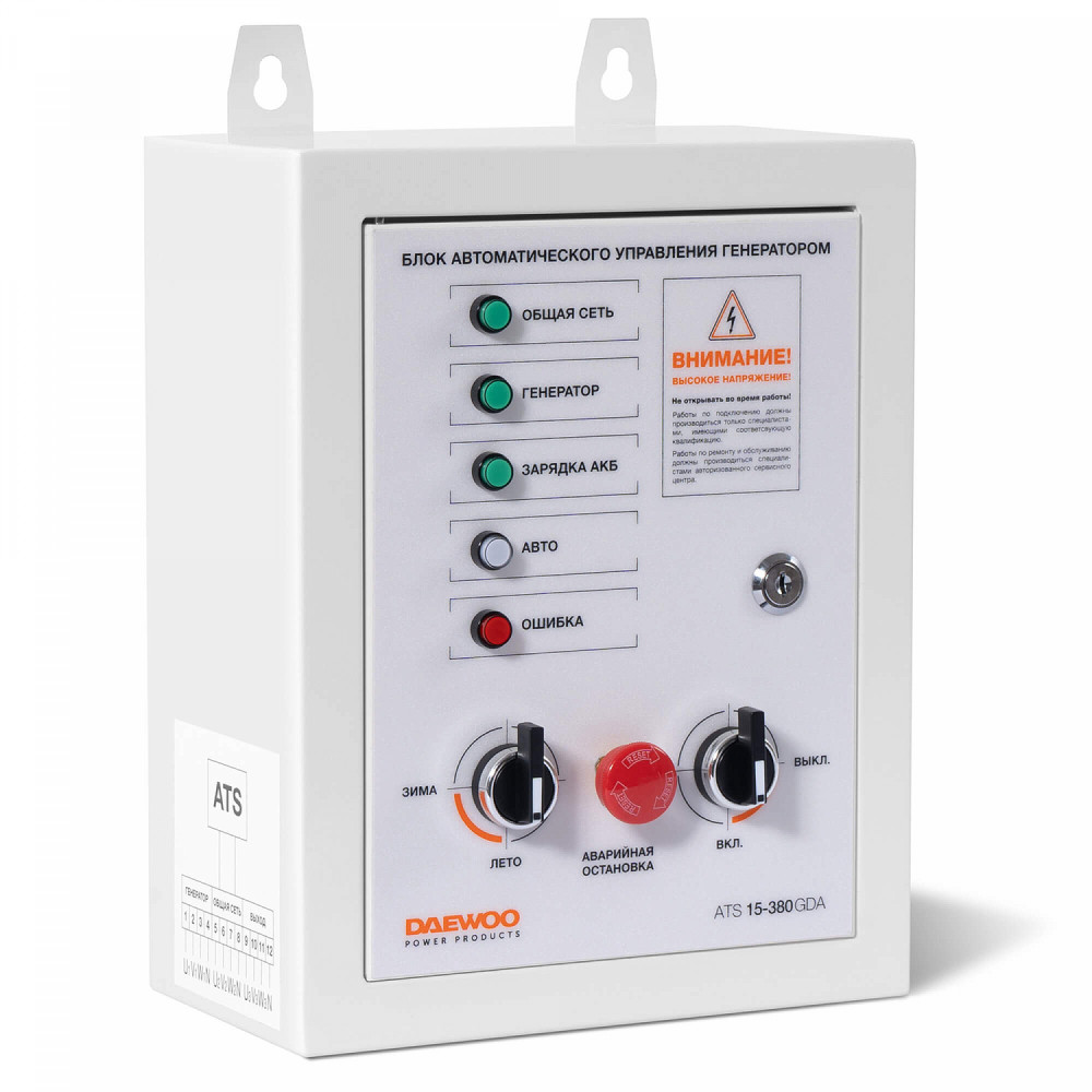 Блок управления генератором DAEWOO ATS 15-380 GDA обеспечивает автоматический запуск электростанции в случае падения напряжения в основной сети или прекращения подачи электроэнергии.