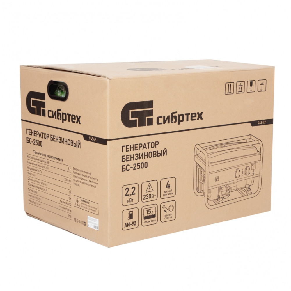 Генератор бензиновый БС-2500, 2.2 кВт, 230В, четырехтактный, 15 л, ручной стартер Сибртех