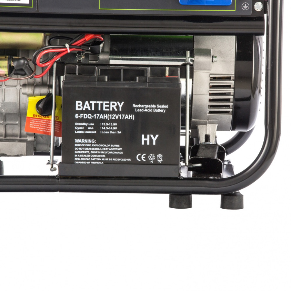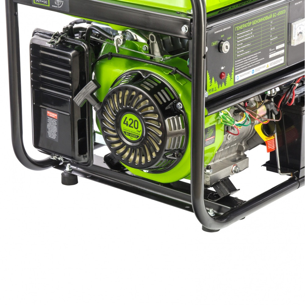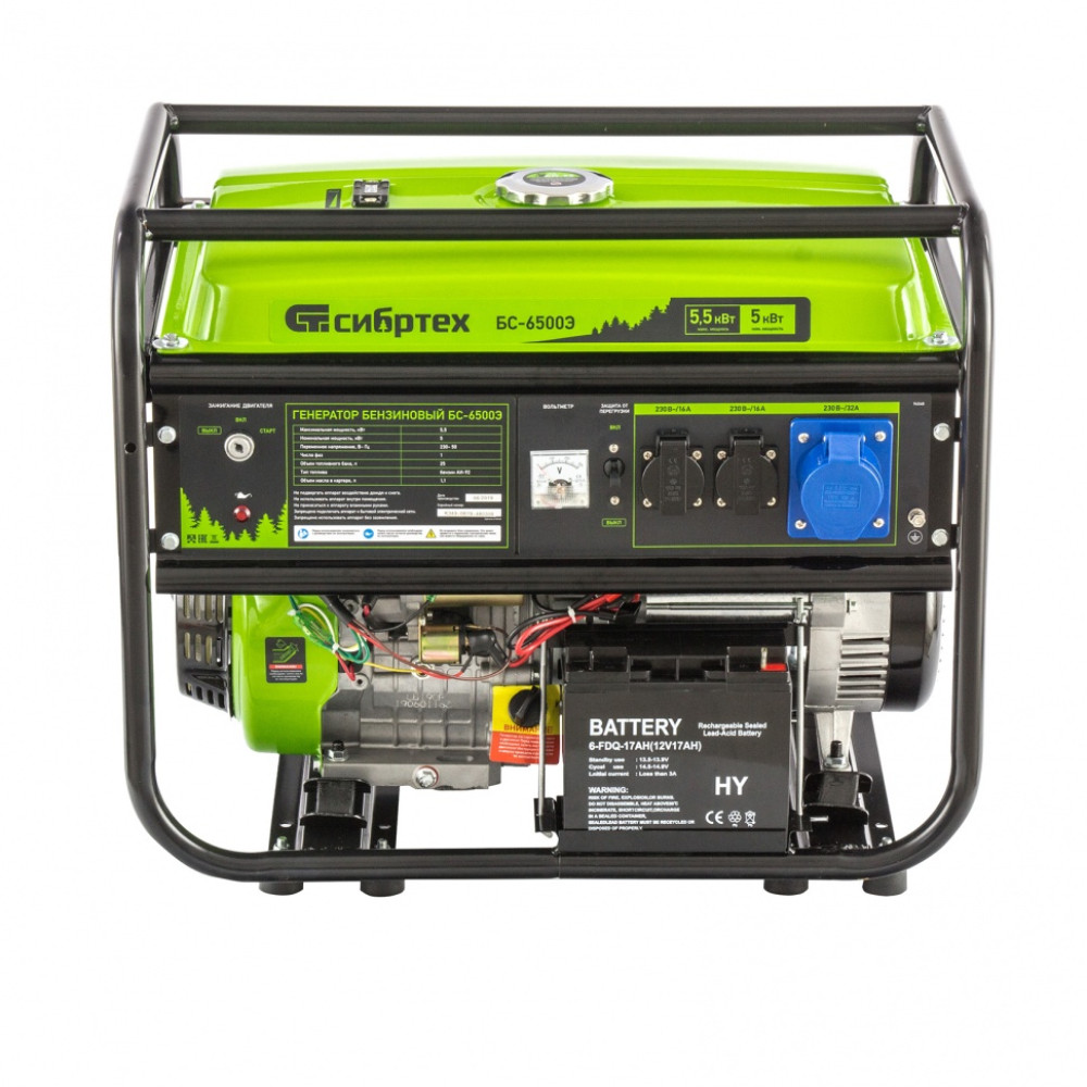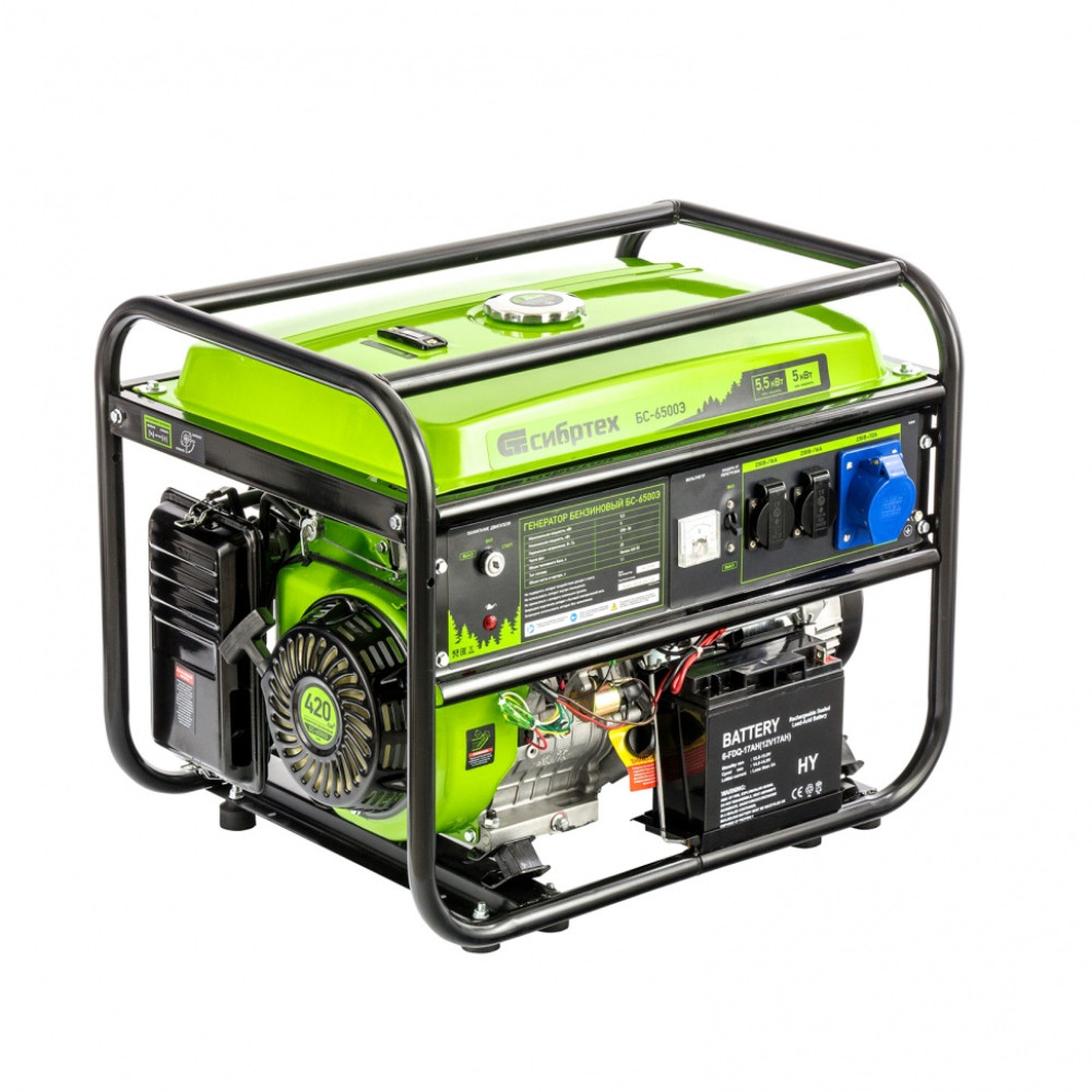 Бензиновый генератор Сибртех БС-6500Э 94548 максимальной мощностью 5,5 кВт, с 4-тактным двигателем, электростартером и баком объемом 25 л, выдает напряжение 230 В и используется для электроснабжения на даче, на строительной площадке, в магазине, в мастерской или гараже. Мощности хватает для обеспечения работы электроинструмента или одновременного подключения 4 ламп накаливания, телевизора, плиты и холодильника. Благодаря электростартеру запуск генератора осуществляется одним поворотом ключа.