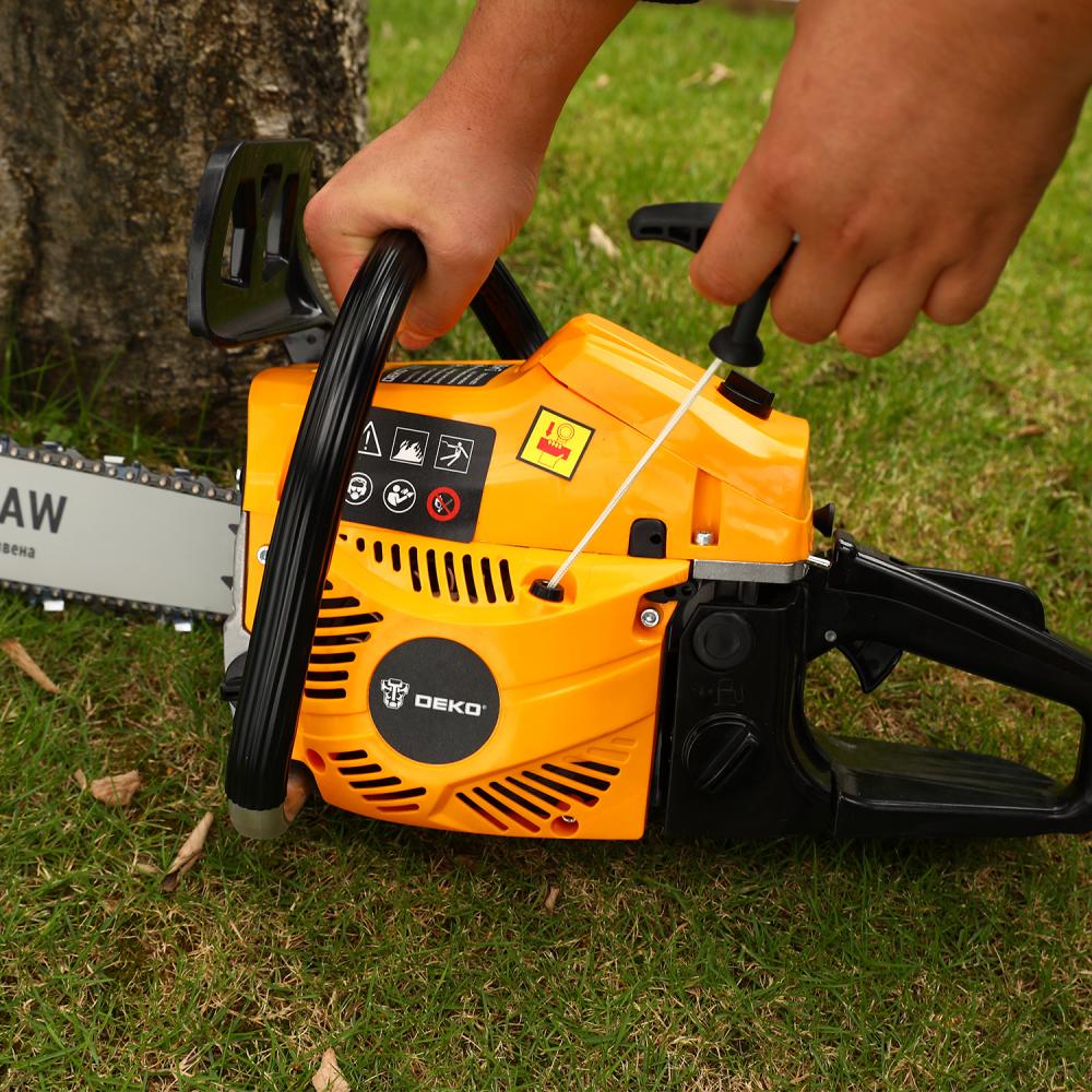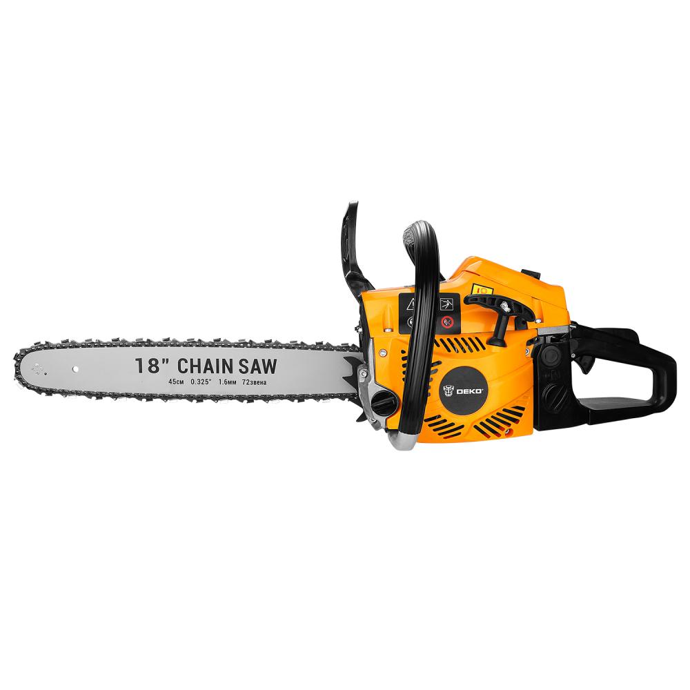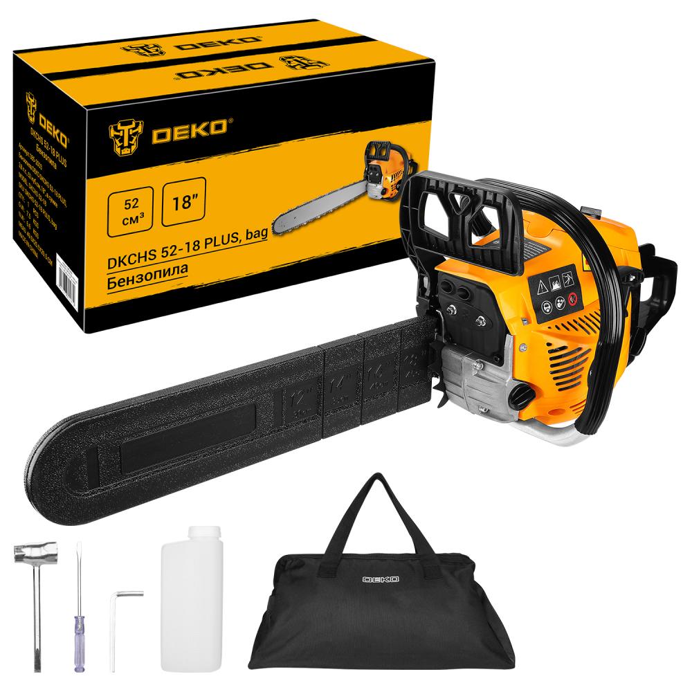 - Бензопила DEKO DKCHS 52-18 PLUS, 3,8 л.с., 52 куб.см, 18", в сумке - мощный и надежный инструмент для распила древесины, подойдет для ухода за деревьями на участке, а также для заготовки дров.