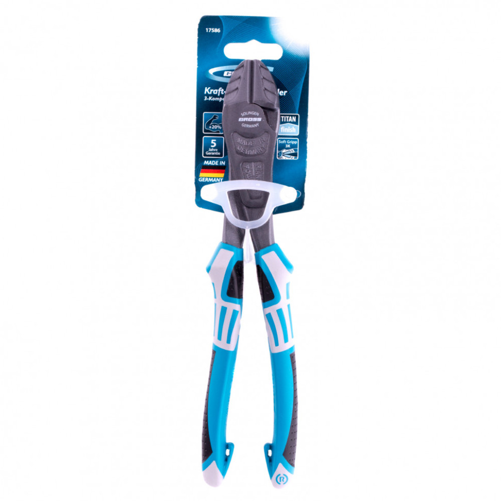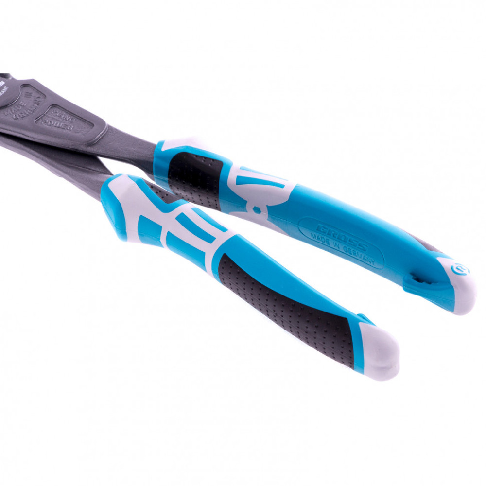 Усиленные бокорезы Gross 17586, 240 мм, с трехкомпонентными рукоятками предназначены для разрезания кабелей, проводов, проволоки, рояльных струн и т.д. Усиленная конструкция позволяет бокорезам перекусывать не только алюминий, медь, пластмассу, но и более жесткие материалы из стали диаметром до 3,5 мм. Встроенный рычажный механизм и смещенный непосредственно к режущим кромкам шарнир увеличивают эффективность реза на 50%.