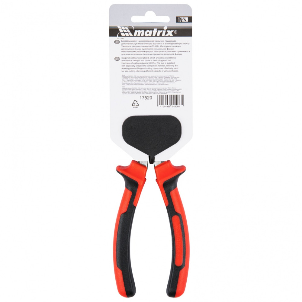 Бокорезы Matrix NICKEL 17520, 160 мм, с никелированным покрытием и двухкомпонентными рукоятками, используются для перекусывания проводов и проволоки. Они пригодятся при проведении монтажных, строительных и слесарных работ не только частным, но и профессиональным мастерам.