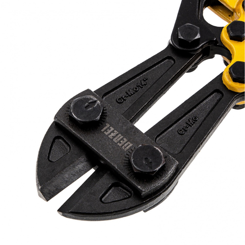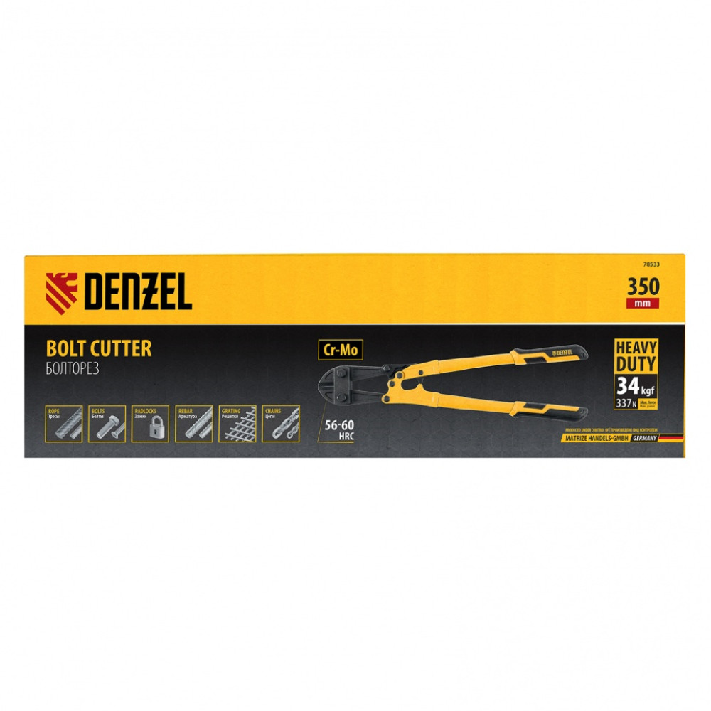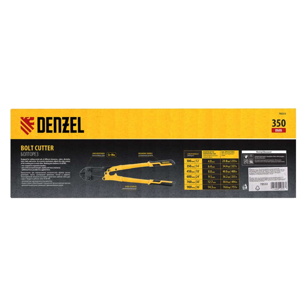 Болторез Denzel 78533 длиной 350 мм (14 дюймов), из стали Cr-Mo, предназначен для перекусывания стальных прутков диаметром 6,4 мм, болтов и шурупов, тросов, разнородной проволоки.