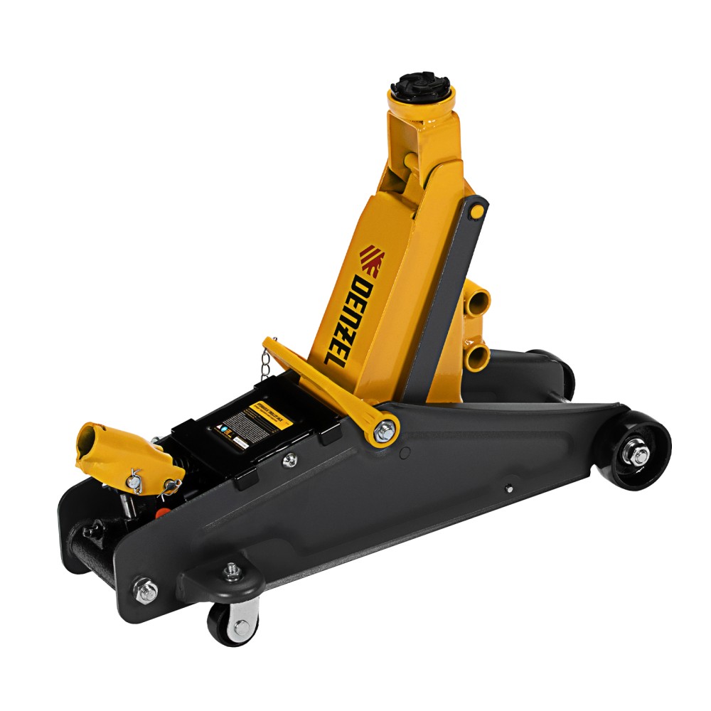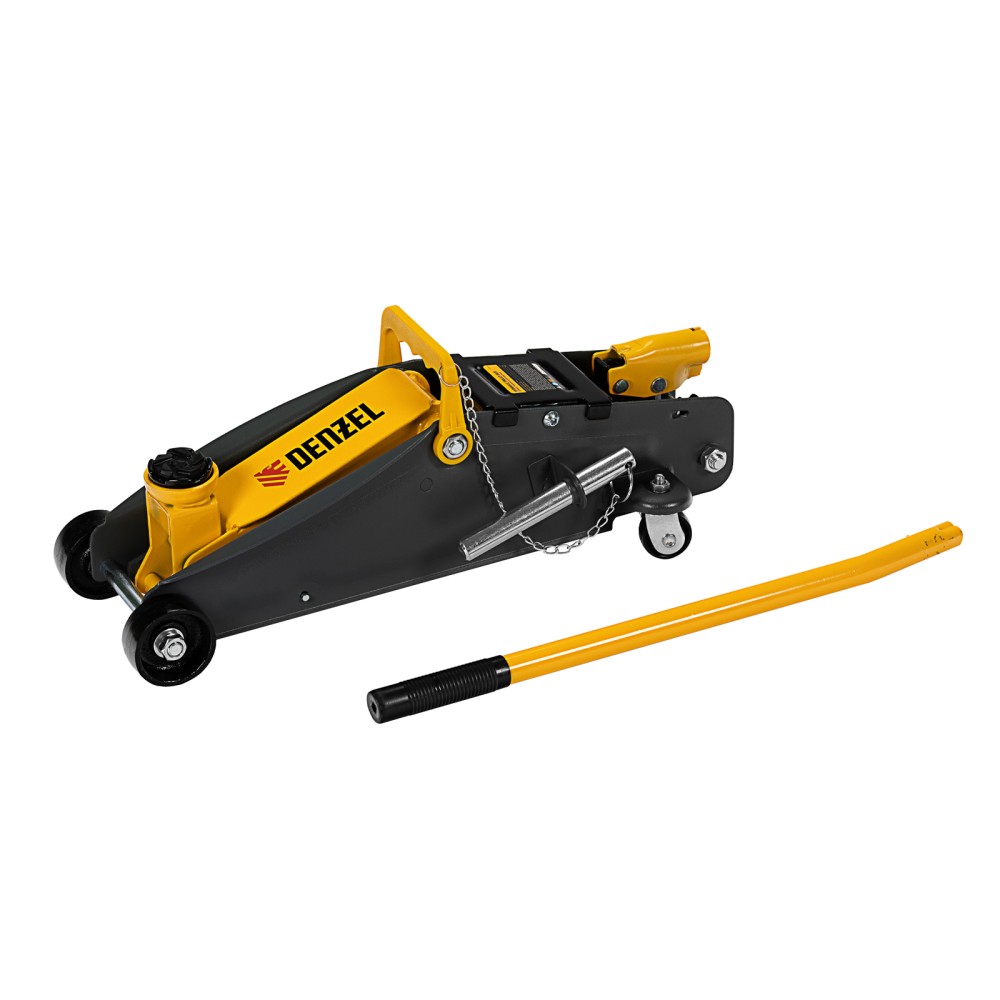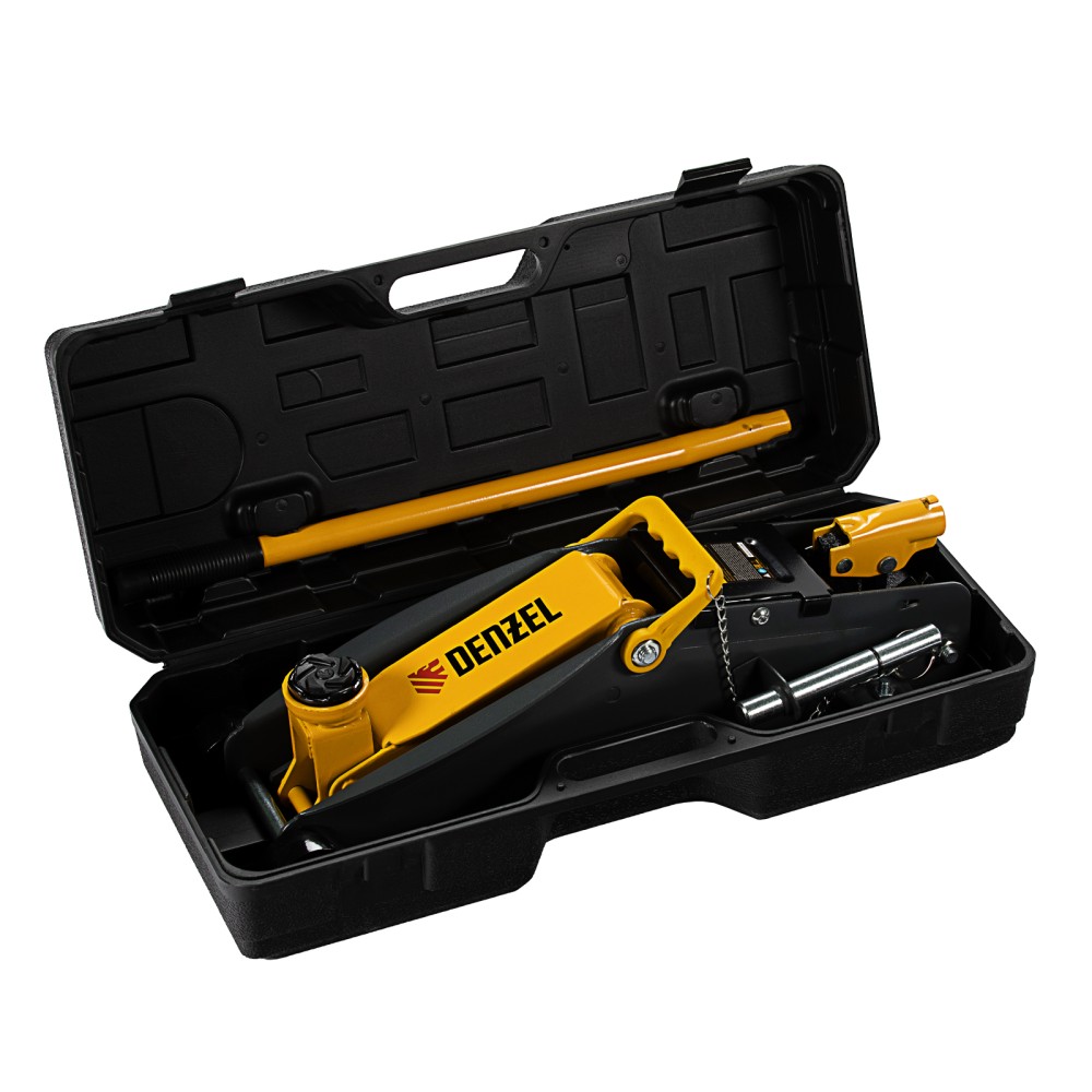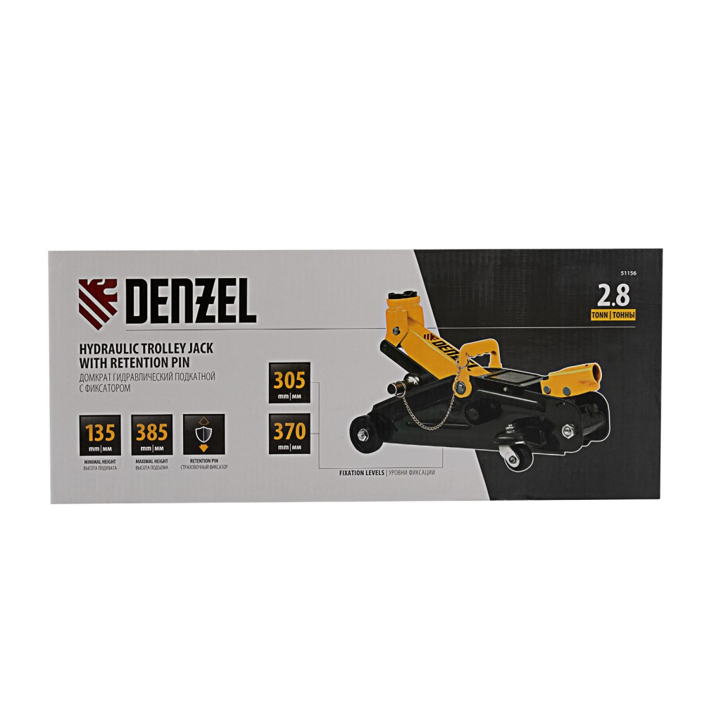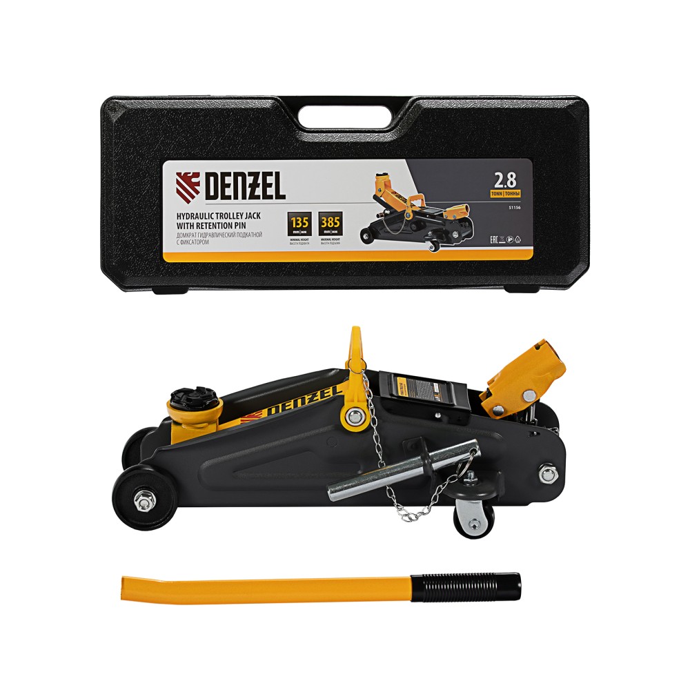 Гидравлический подкатной домкрат с фиксатором Denzel 51156, с высотой подхвата 135 мм, предназначен для плавного подъема грузов массой до 2,8 т на высоту до 385 мм. Страховочный штифт позволяет фиксировать подъемный рычаг на высоте 305 и 370 мм для безопасной работы. Домкрат пригодится владельцам легковых автомобилей со стандартным клиренсом.ПреимуществаЗащита от поломки — предохранительный клапан не допускает подъема груза массой более 2,8 т.Резиновая поворотная опора — груз надежно фиксируется, а кузов авто защищен от повреждений.Эргономичность — домкрат имеет переставную рукоятку для комфортного перемещения и извлечения из-под автомобиля.Удобное хранение и транспортировка — домкрат поставляется в прочном пластиковом кейсе.