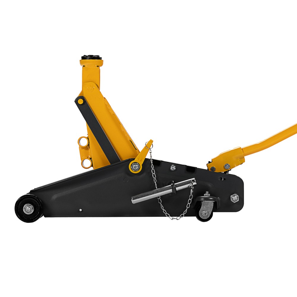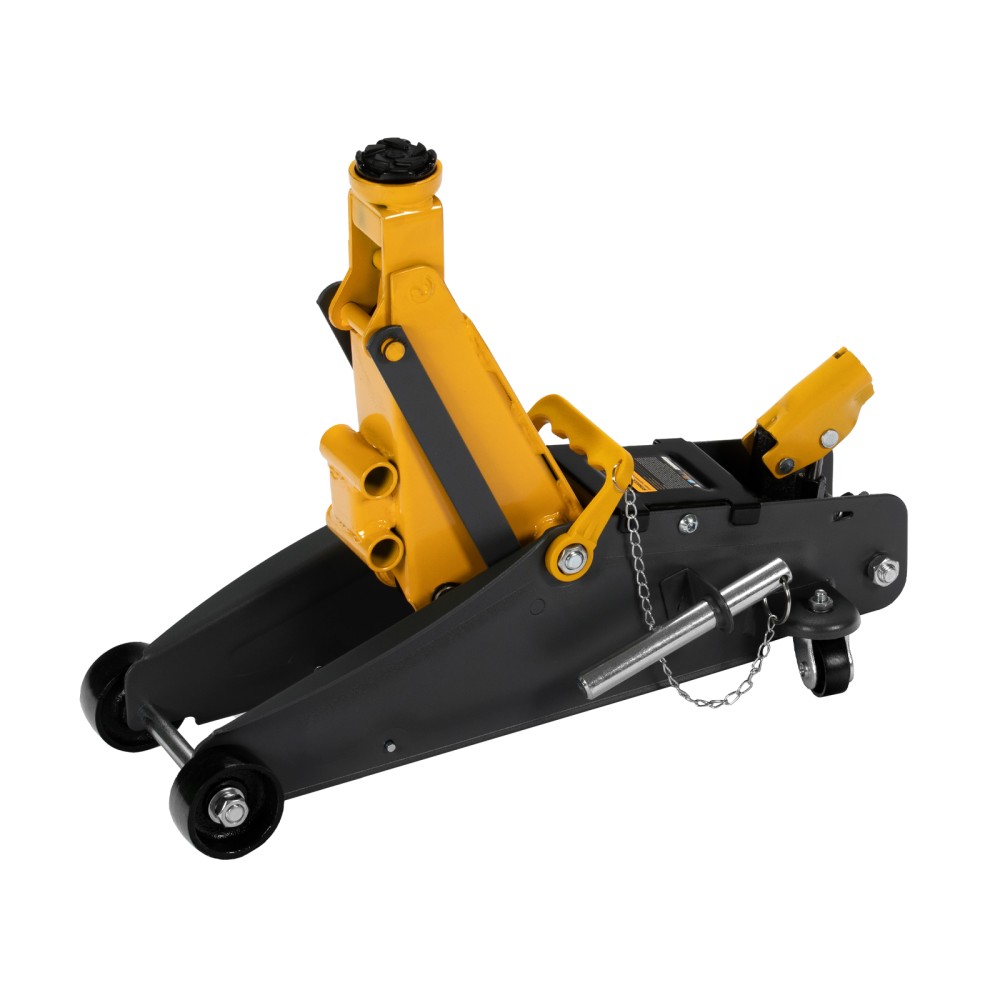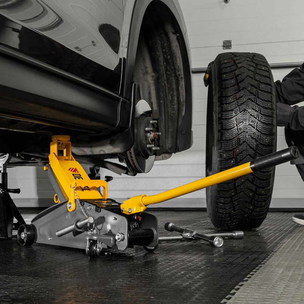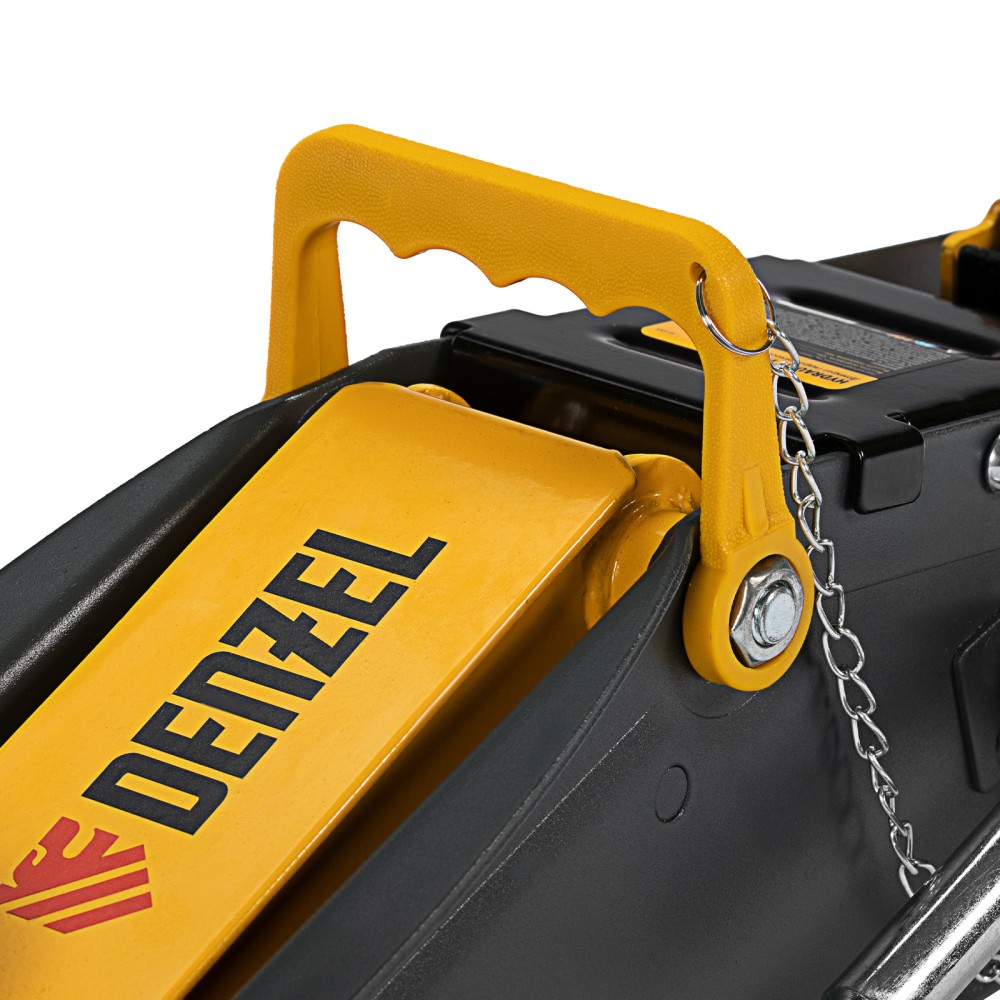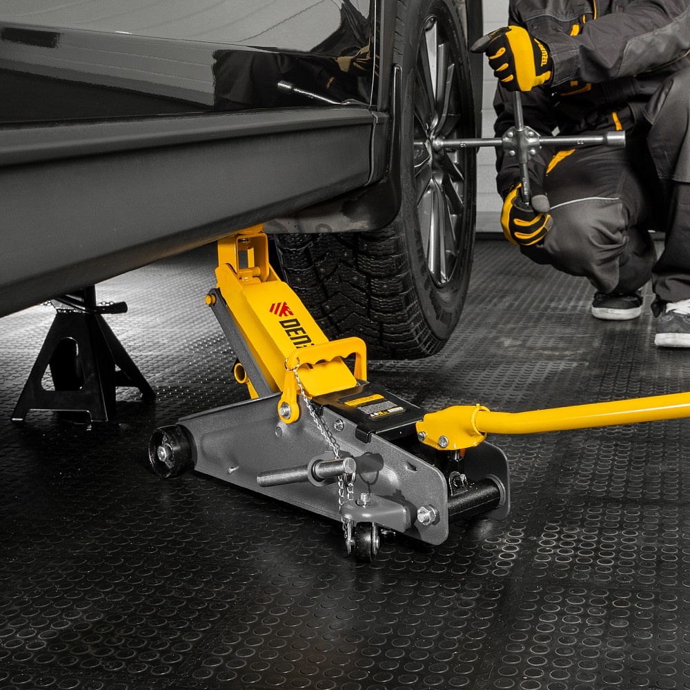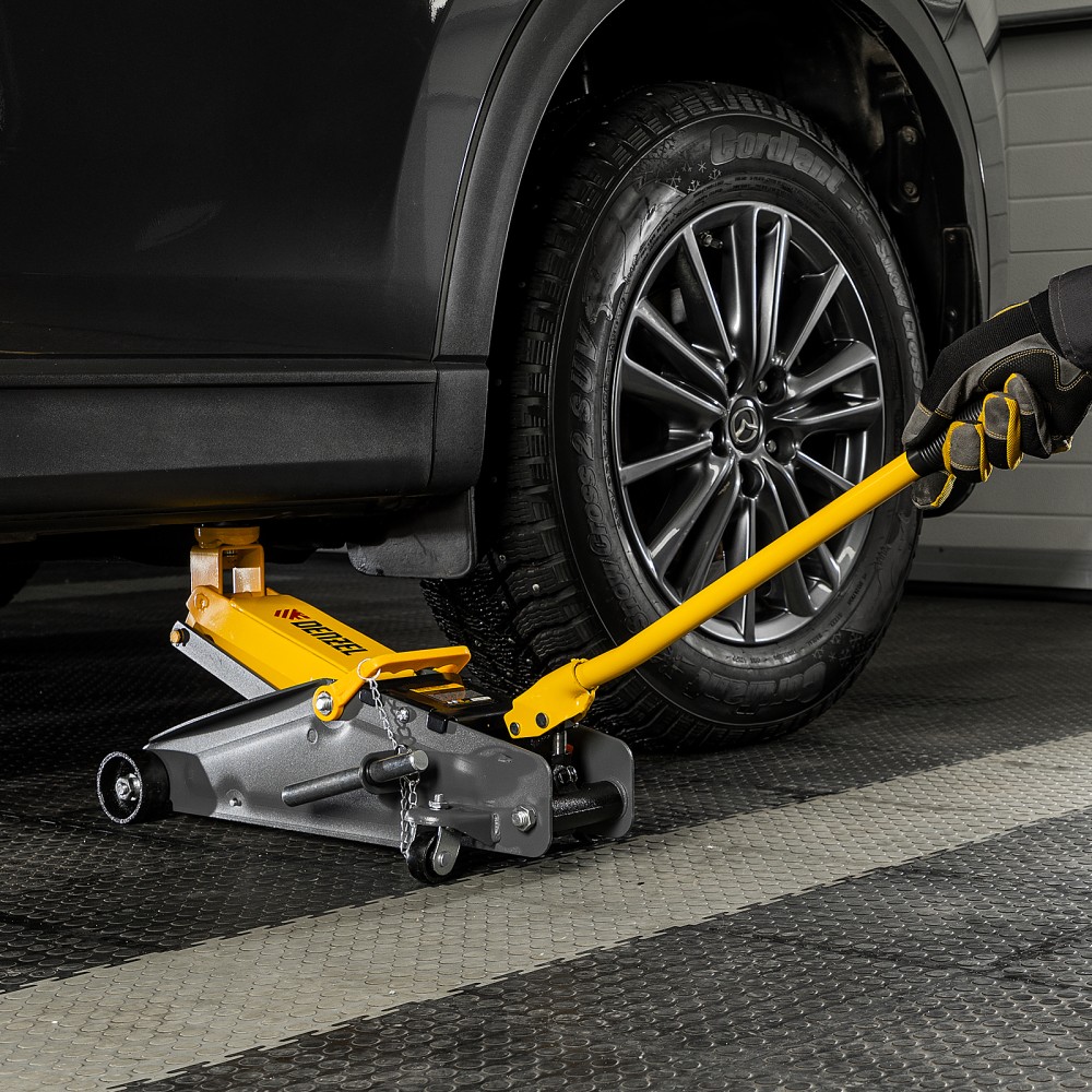 Гидравлический подкатной домкрат с фиксатором Denzel 51156, с высотой подхвата 135 мм, предназначен для плавного подъема грузов массой до 2,8 т на высоту до 385 мм. Страховочный штифт позволяет фиксировать подъемный рычаг на высоте 305 и 370 мм для безопасной работы. Домкрат пригодится владельцам легковых автомобилей со стандартным клиренсом.ПреимуществаЗащита от поломки — предохранительный клапан не допускает подъема груза массой более 2,8 т.Резиновая поворотная опора — груз надежно фиксируется, а кузов авто защищен от повреждений.Эргономичность — домкрат имеет переставную рукоятку для комфортного перемещения и извлечения из-под автомобиля.Удобное хранение и транспортировка — домкрат поставляется в прочном пластиковом кейсе.