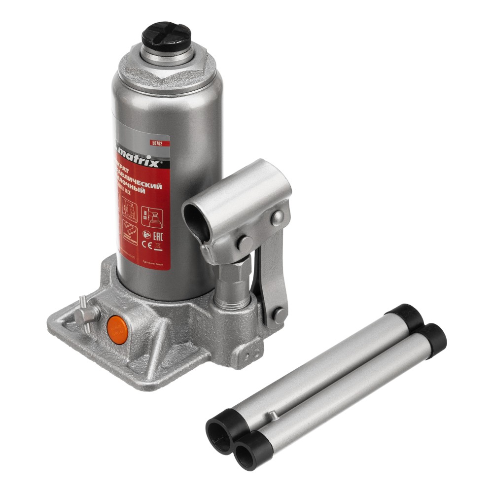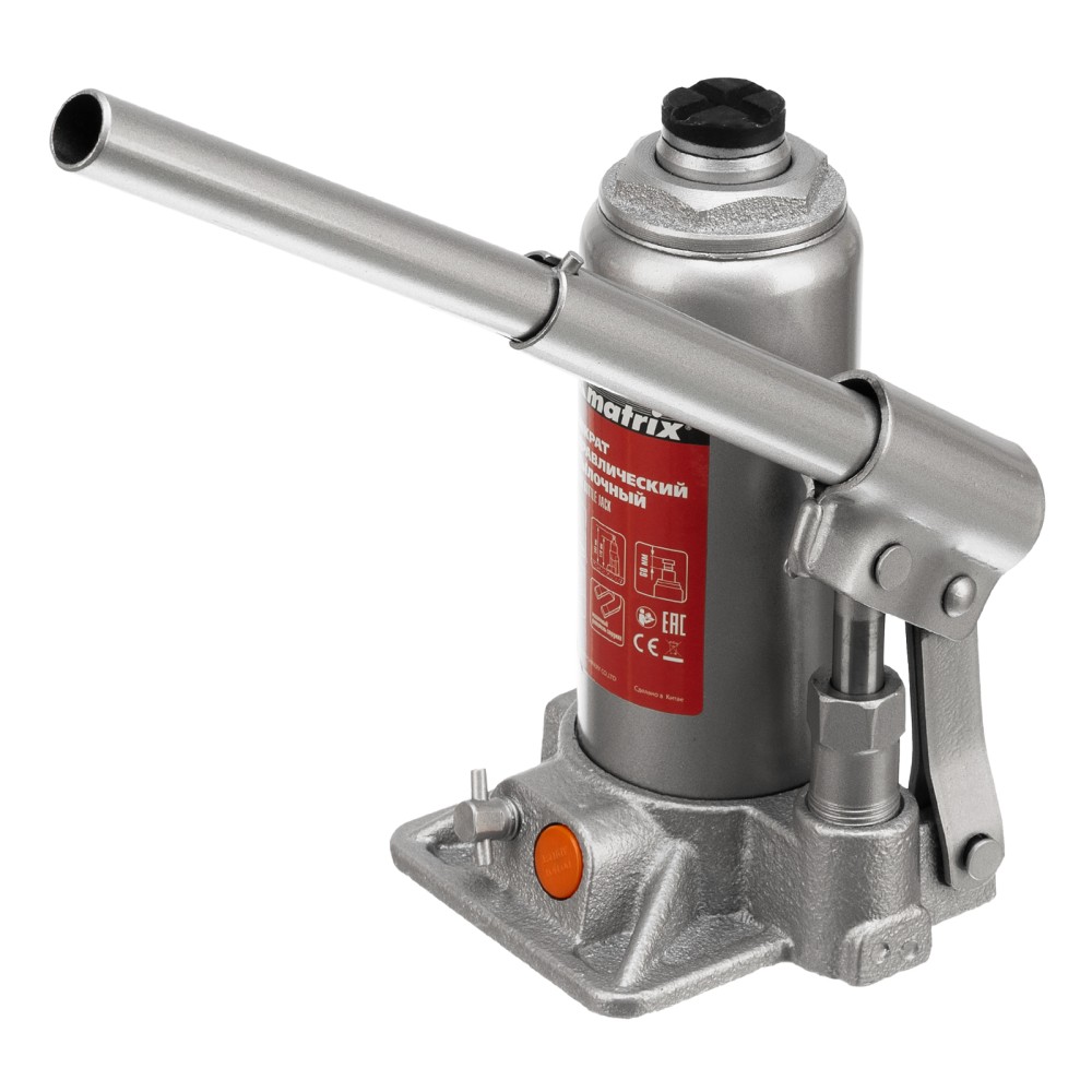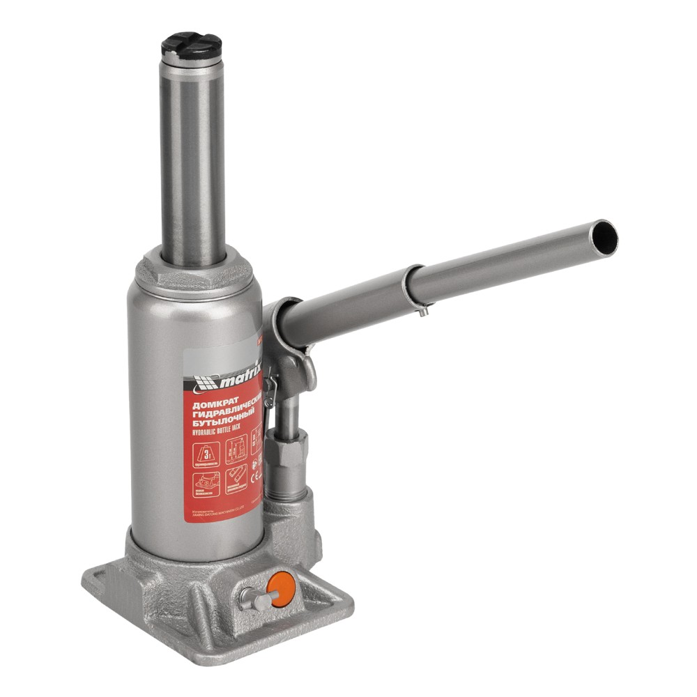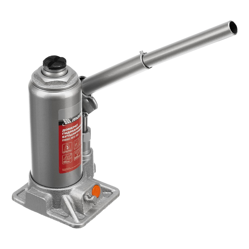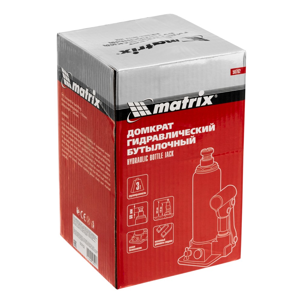 Гидравлический бутылочный домкрат Matrix 50762 предназначен для быстрого поднятия грузов массой до 3 т на высоту 178-343 мм. Будет полезен автолюбителям и мастерам СТО в качестве полупрофессионального инструмента. Встроенный магнитный уловитель металлической стружки защищает резиновые уплотнители от повреждений.ПреимуществаЗащита от перегрузки — клапан безопасности не допускает поднятия груза массой более 3000 кг.Надежность — подъемное устройство выполнено из прочной коррозионностойкой стали.Разборный корпус — домкрат можно отремонтировать при необходимости.Удобная транспортировка — домкрат весом 3 кг легко помещается в багажник авто.