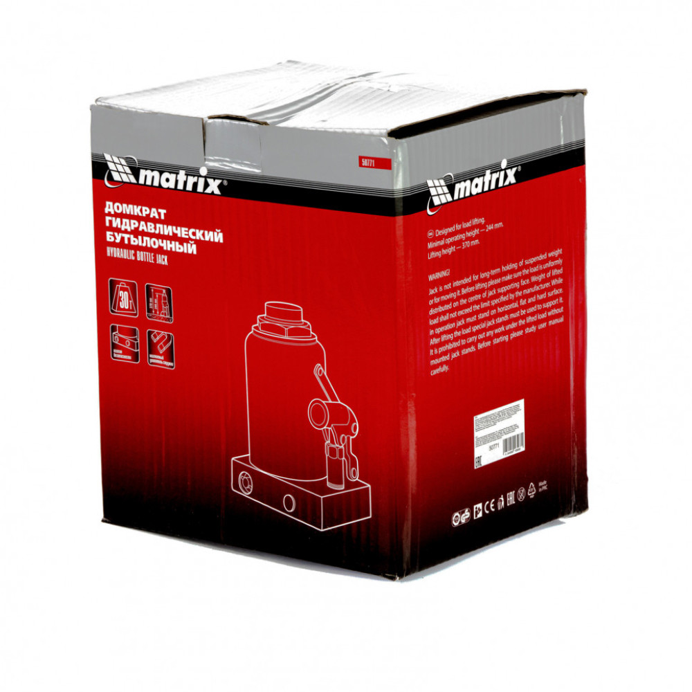 Домкрат гидравлический бутылочный Matrix 50771 предназначен для быстрого поднятия грузов весом до 30 т на высоту 244-370 мм. Он будет полезен автолюбителям и мастерам СТО в качестве полупрофессионального инструмента. Встроенный магнитный уловитель не допускает распространения металлической стружки по домкрату, таким образом обеспечивается защита резиновых уплотнителей от повреждений.