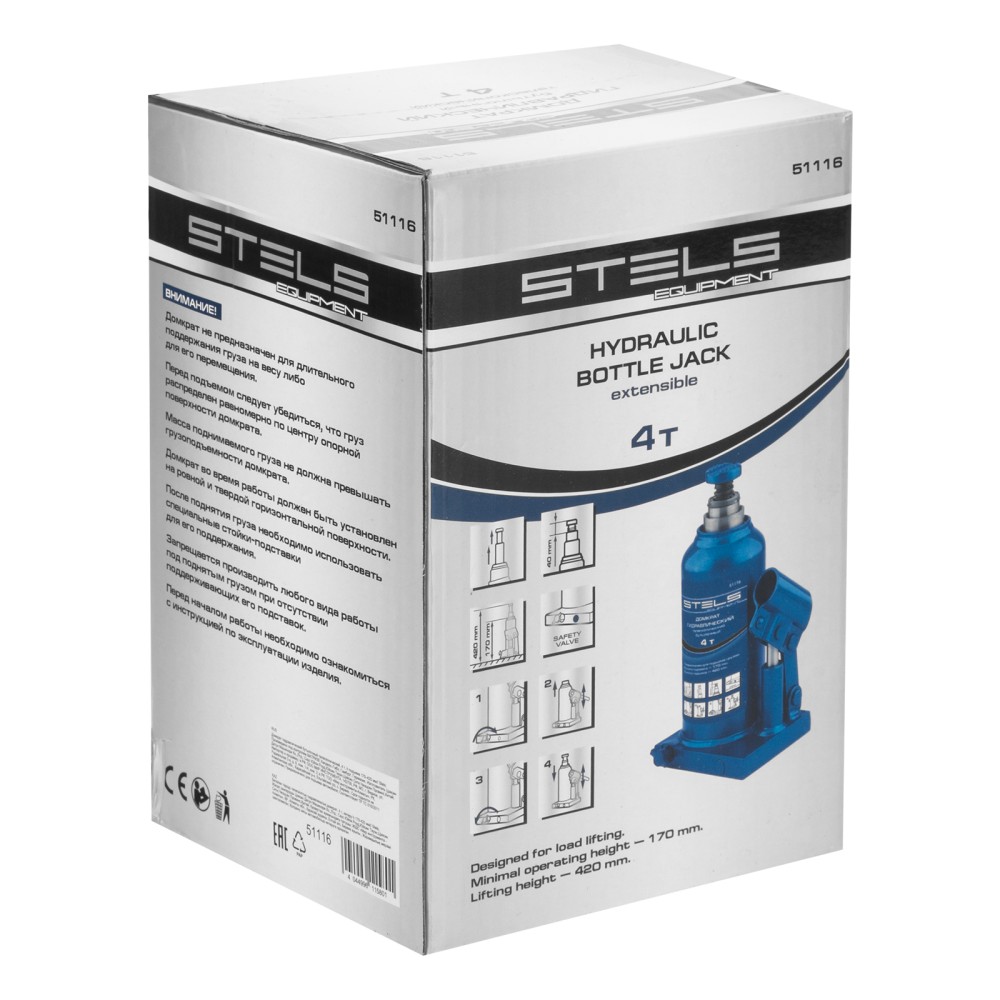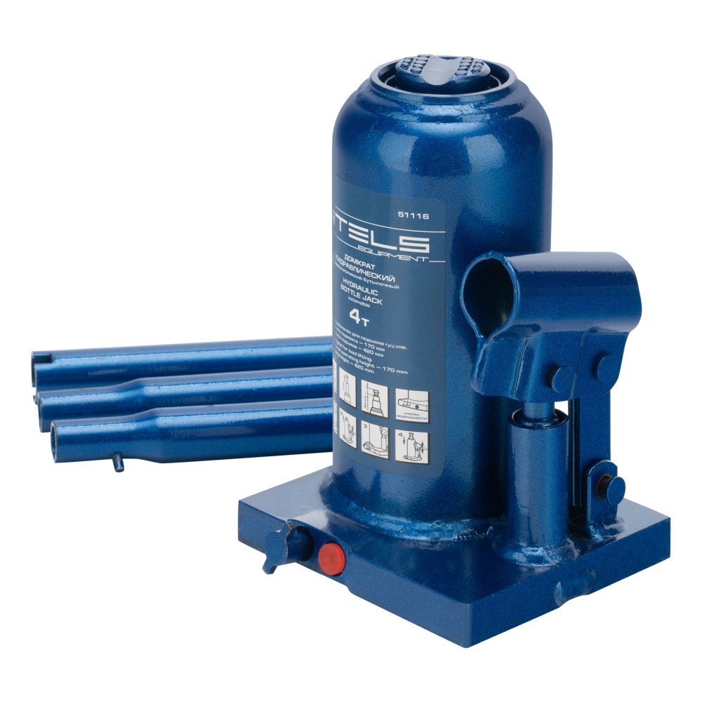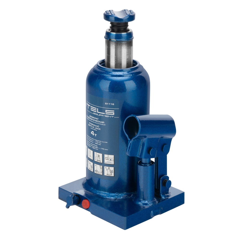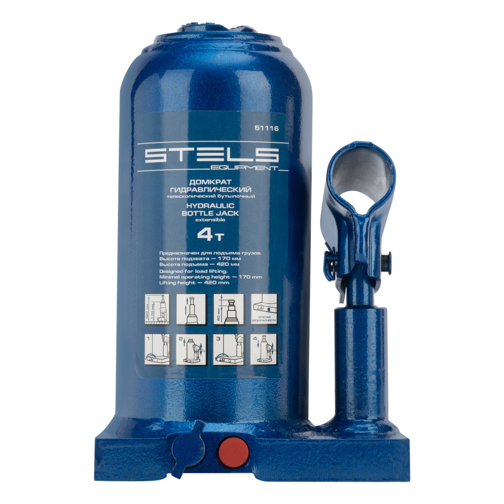 Гидравлический бутылочный телескопический домкрат Stels 51116 используется для поднятия грузов весом до 4 т с на высоту 170-420 мм. Не требует больших усилий и оптимален для автомобилей с большим клиренсом. Домкрат можно использовать в гараже для самостоятельного ремонта машины или в автосервисе для решения профессиональных задач.ПреимуществаЗащита от поломки — клапан безопасности не позволяет поднимать грузы массой свыше 4000 кг.Надежная конструкция — основание и корпус выполнены из стали и сварены между собой.Малый вес 4,85 кг — домкрат легко перемещать и перевозить в багажнике машины.