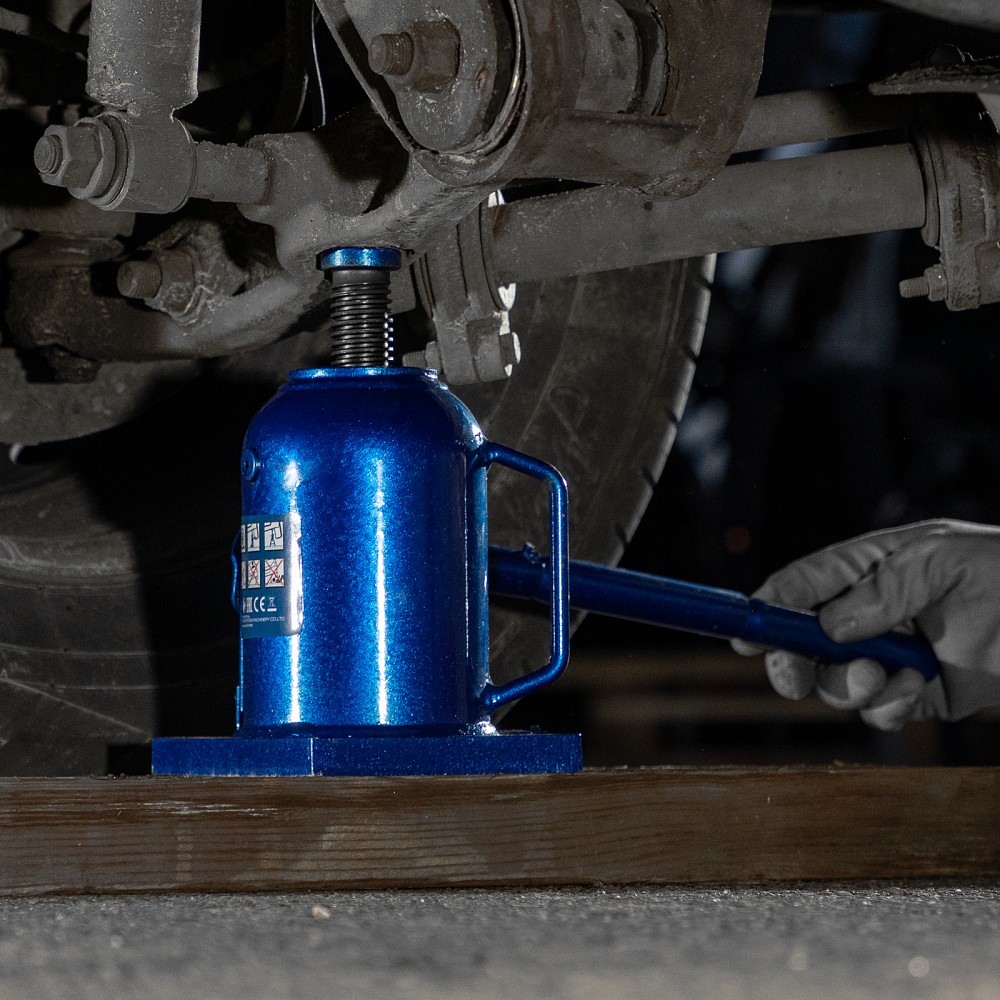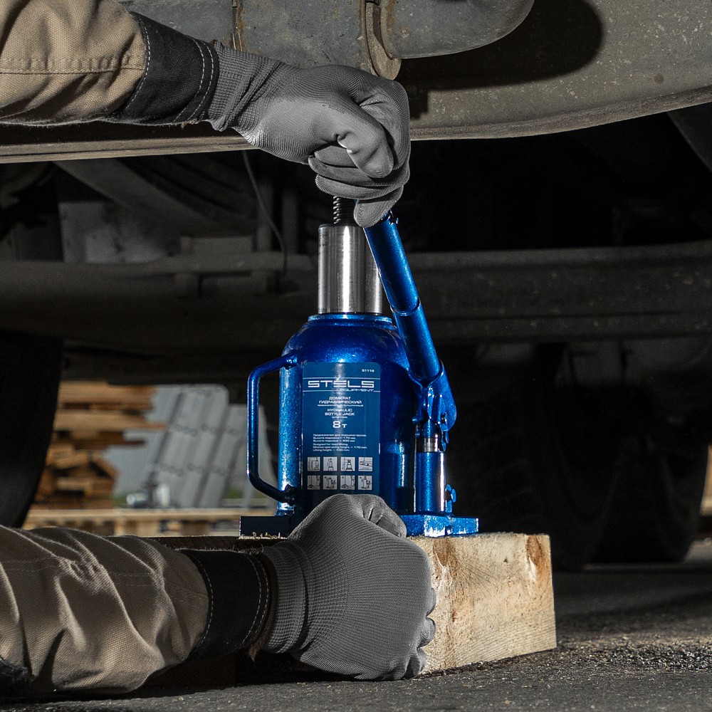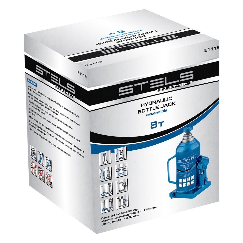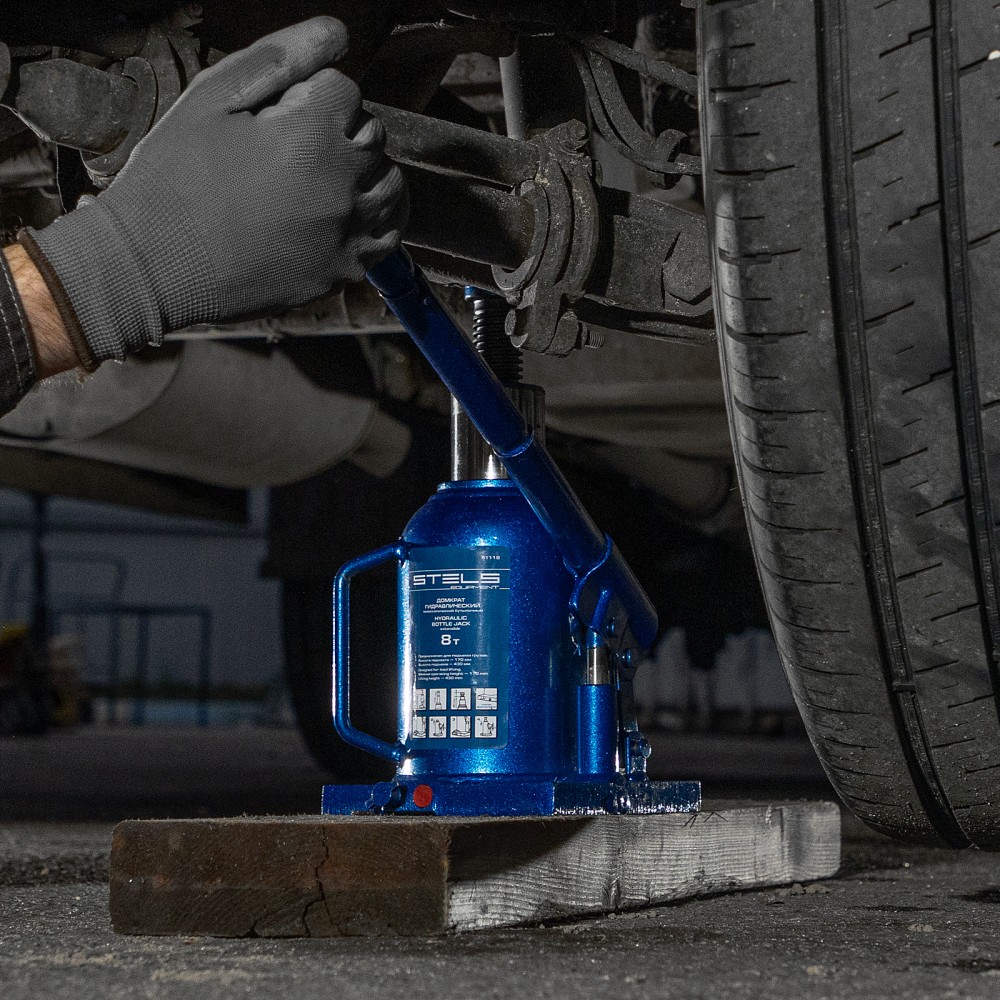 Гидравлический бутылочный телескопический домкрат Stels 51118 используется для поднятия грузов весом до 8 т с на высоту 170-430 мм. Не требует больших усилий и оптимален для автомобилей с большим клиренсом. Домкрат можно использовать в гараже для самостоятельного ремонта машины или в автосервисе для решения профессиональных задач.ПреимуществаЗащита от поломки — клапан безопасности не позволяет поднимать грузы массой свыше 8000 кг.Надежная конструкция — основание и корпус выполнены из стали и сварены между собой.Удобная транспортировка — на корпусе предусмотрена специальная ручка.