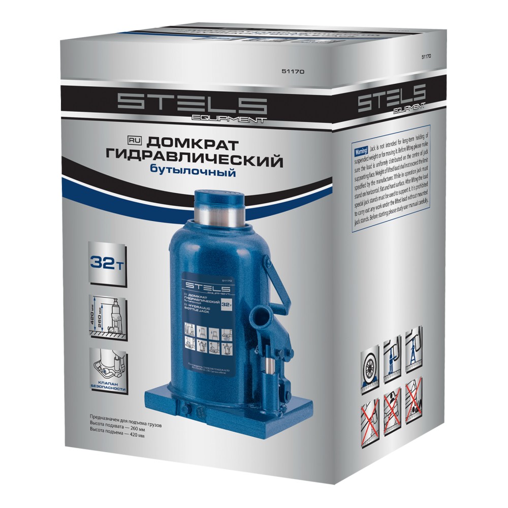 Гидравлический бутылочный домкрат Stels 51170 применяется для быстрого поднятия грузов весом до 32 т на высоту 260-3420 мм. Оптимален для автомобилей с большим клиренсом. Домкрат будет полезен автолюбителям и профессионалам для ремонта транспортного средства.ПреимуществаБезопасная эксплуатация — благодаря предохранительному клапану домкрат не поднимает грузы тяжелее 32 т.Прочность и долговечность — корпус выполнен из коррозионностойкой стали.Надежная конструкция — домкрат не имеет резьбовых соединений, т.к. корпус приварен к станине.
