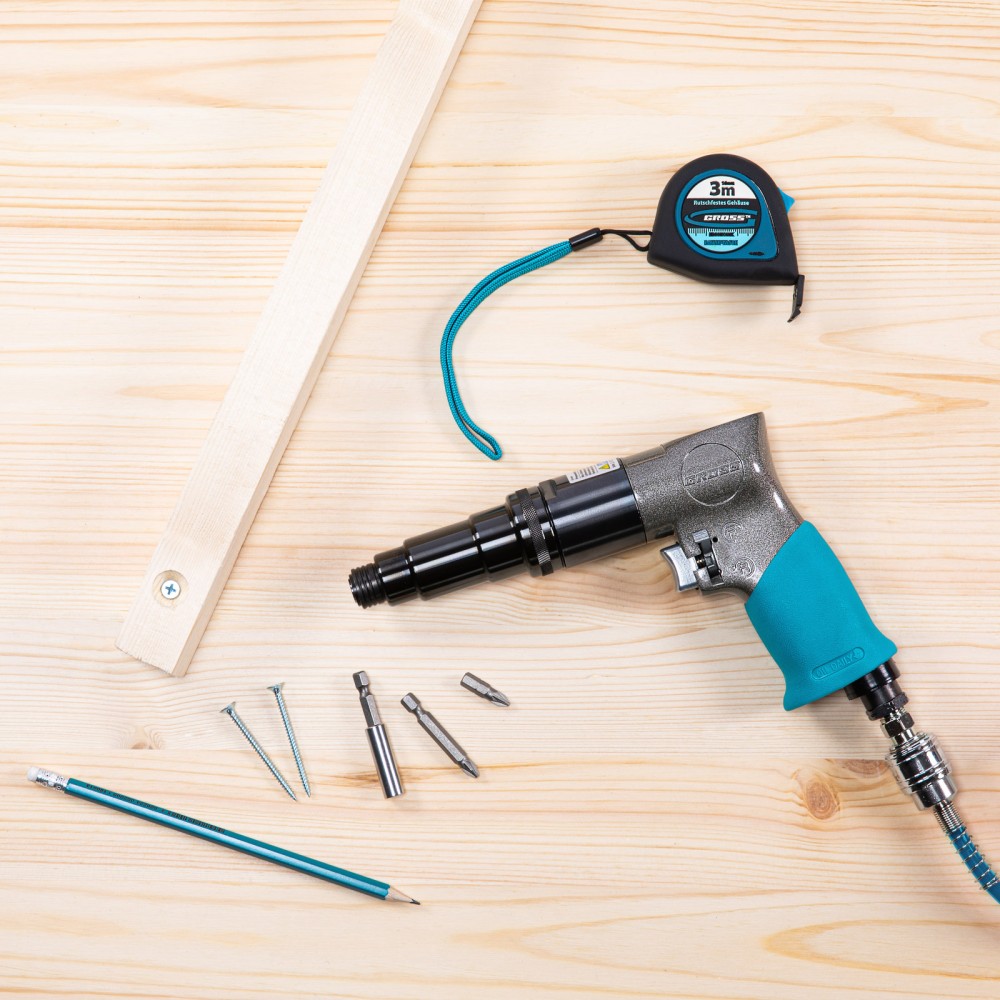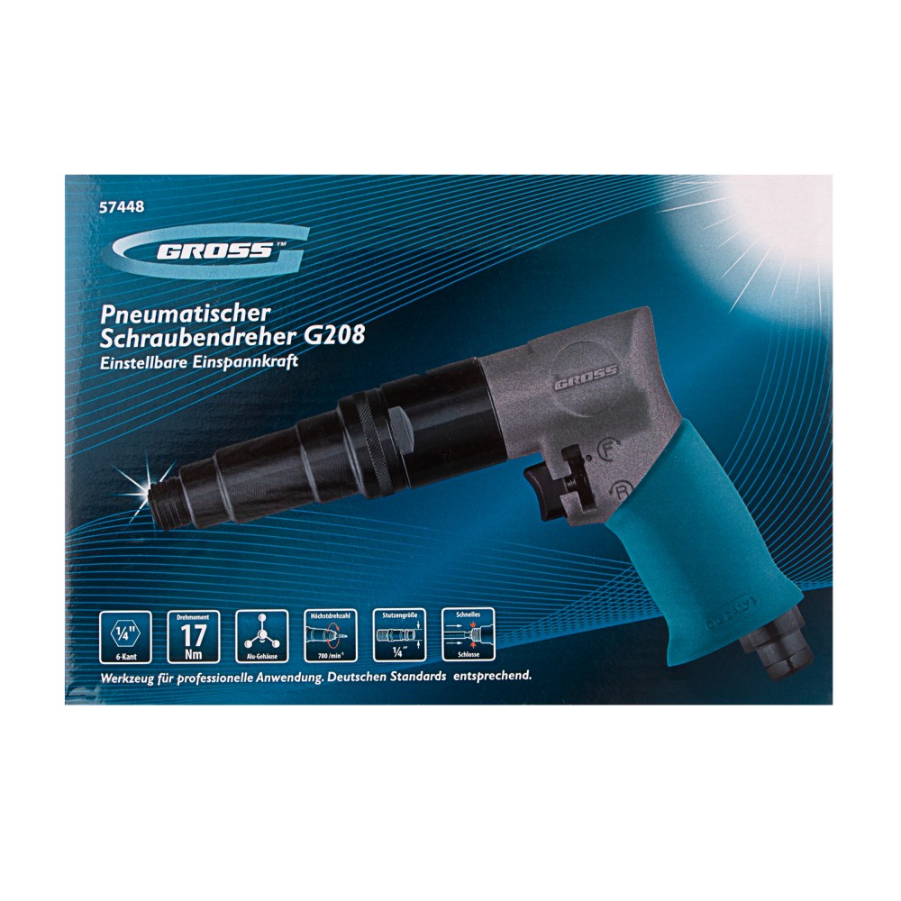 Пневматический шуруповерт Gross G208 57448 с присоединительным размером 1/4″, максимальным крутящим моментом 17 Нм и скоростью вращения шпинделя 700 об/мин, используется для демонтажа старых крепежей и вкручивания новых. Высокая производительность инструмента позволяет быстро справляться с работой. Расход воздуха составляет 212 л/мин, поэтому пневмошуруповерт можно подключить к компрессору средней мощности. Инструмент легко выдерживает интенсивные нагрузки и может долго работать без остановки, поэтому будет полезен не только в быту, но и на строительной площадке.ПреимуществаИзносостойкость — корпус из композитного материала характеризуется высокой прочностью.Регулировка силы затяжки — крутящий момент настраивается в пределах 5-17 Нм, благодаря чему можно установить оптимальный режим работы.Функция реверса — можно не только закручивать, но и откручивать крепежи.Быстросъемное соединение — шуруповерт легко подключается к компрессору, что экономит время мастера.Комфортная эксплуатация — рукоятка с резиновым покрытием обеспечивает надежный хват.Вес 1 кг — инструментом можно долго работать без усталости и выполнять большие объемы работ.3-летняя гарантия на заводской брак — высокое качество изделия подтверждено производителем.