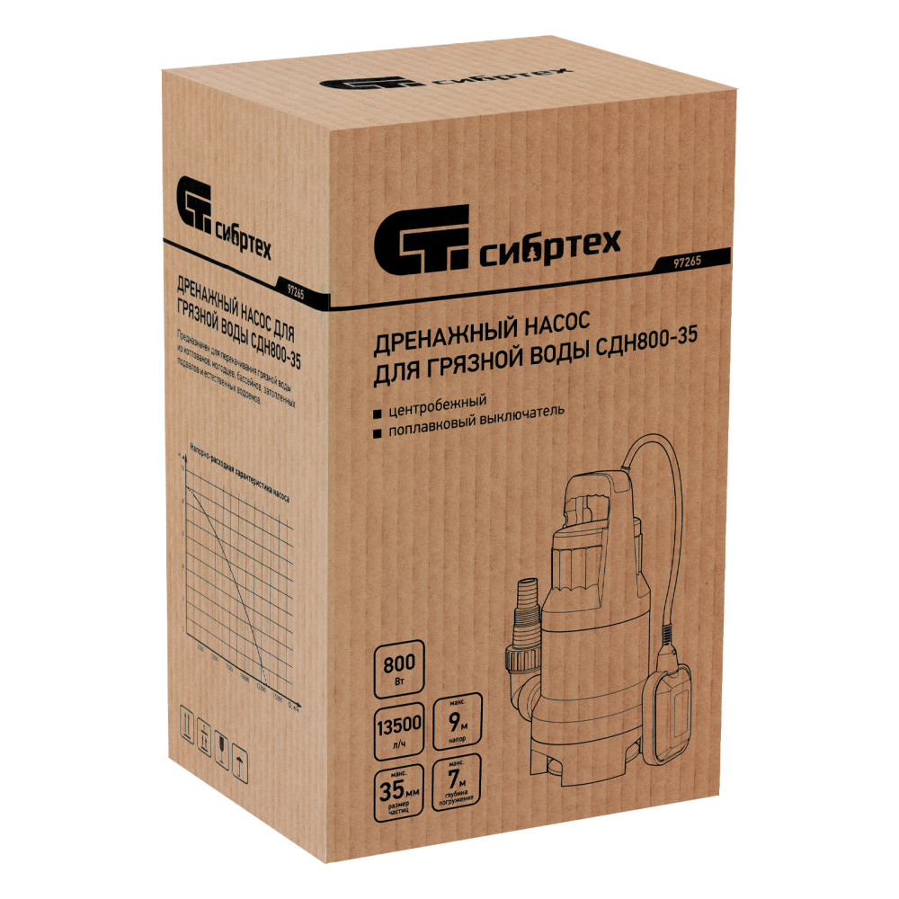 Дренажный насос Сибртех СДН800-35 97265 мощностью 800 Вт и производительностью 13500 л/ч обеспечивает напор до 9 м и используется для откачки из колодцев, резервуаров, водоемов, канав или траншей чистой и грязной воды с частицами диаметром до 35 мм, а также жидких бытовых отходов. Позволяет организовать систему полива или осушения подвала, погреба. Подходит не только для бытовых нужд, но и для проведения строительных и коммунальных работ. Благодаря поплавковому механизму, защищающему от сухого хода, насос работает автономно, отключаясь при достижении уровнем воды заданного минимума.