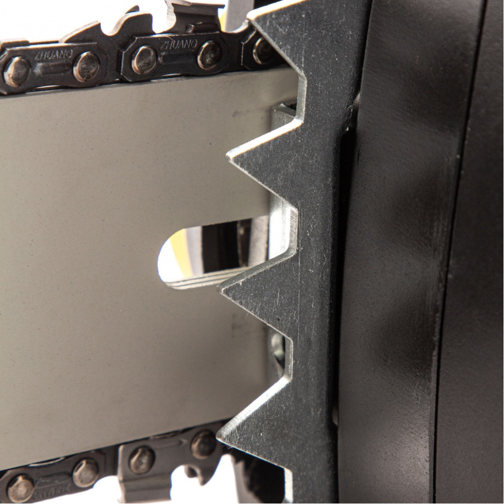 Зубчатый упор, сделанный из высокопрочной стали, обеспечивает фиксацию пилы на распиливаемом дереве и облегчает работу. В результате оператор тратит меньше сил и может добиться аккуратной линии среза.