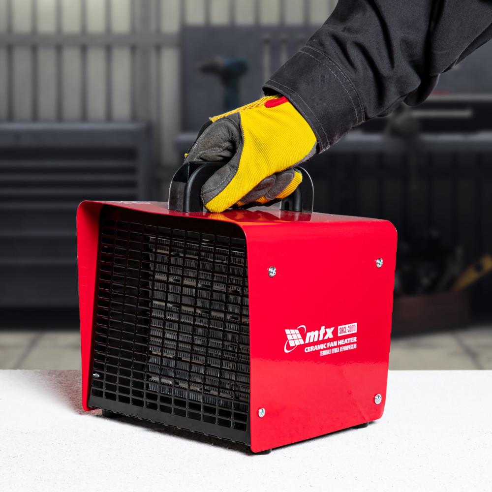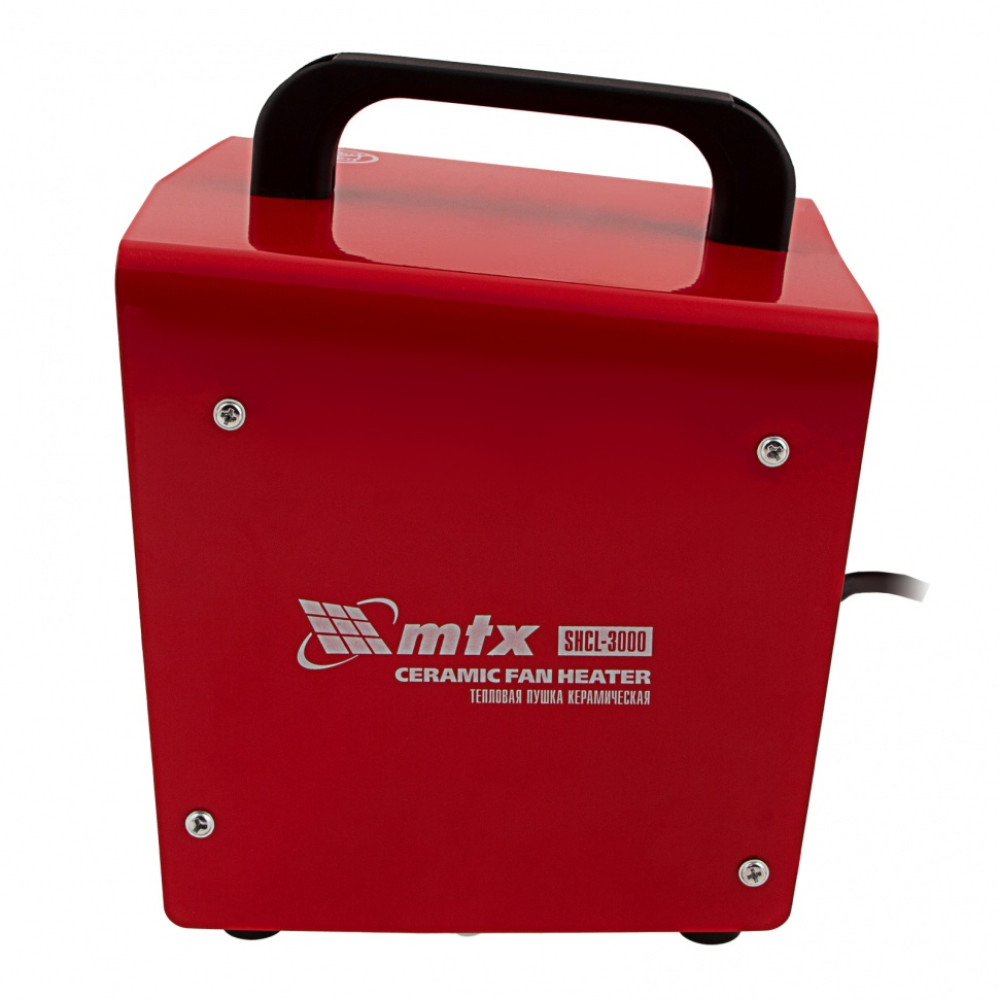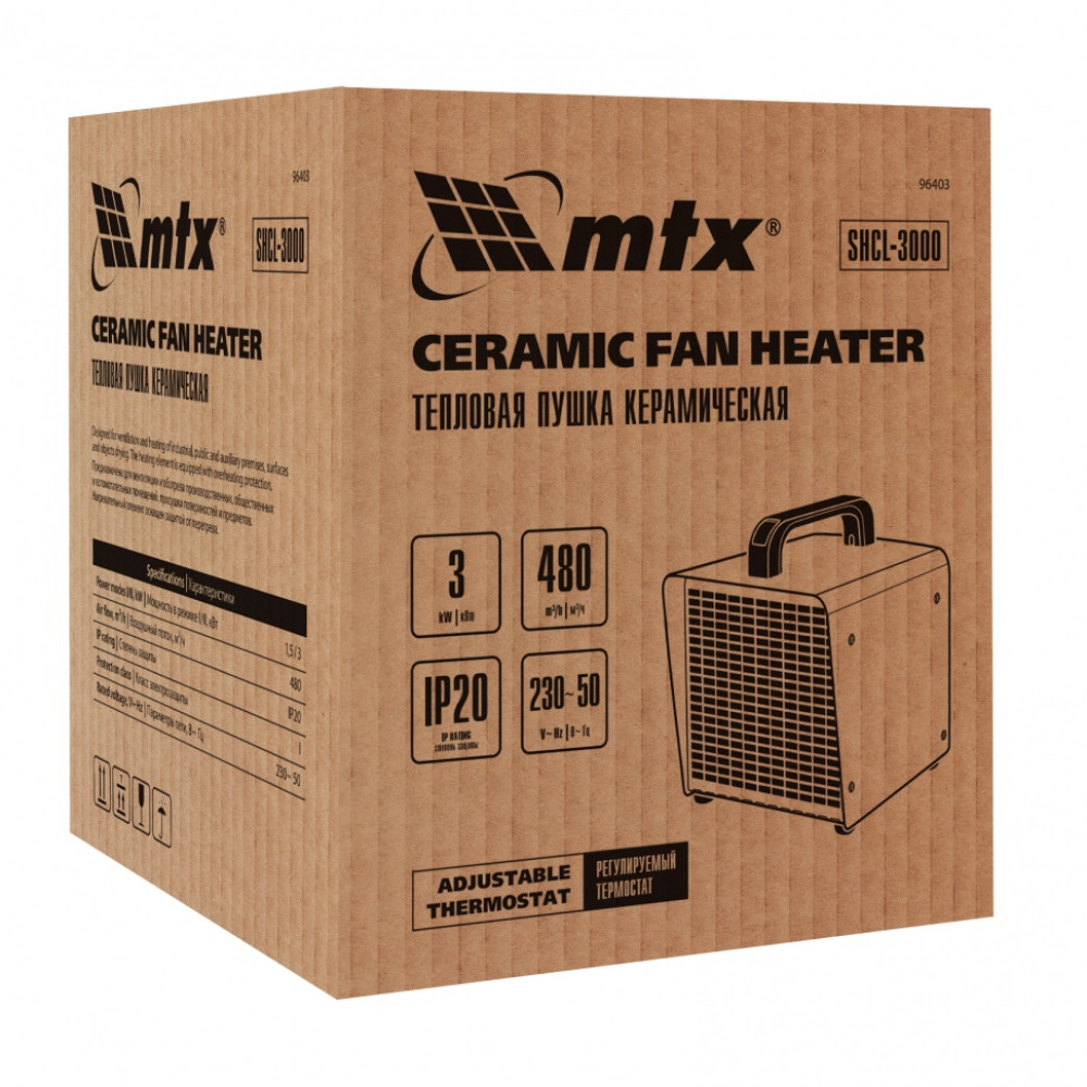Керамическая тепловая пушка MTX SHCL-3000 96403 производительностью 480 куб. м/ч, в квадратном корпусе, работает в режиме нагрева на полной мощности 3 кВт или частичной 1,5 кВт, а также в режиме вентиляции. Предназначена для обогрева цехов, складов, мастерских и других нежилых помещений площадью до 40 кв. м. Также позволяет быстро просушивать различные поверхности, например, стяжки пола или оштукатуренные стены.