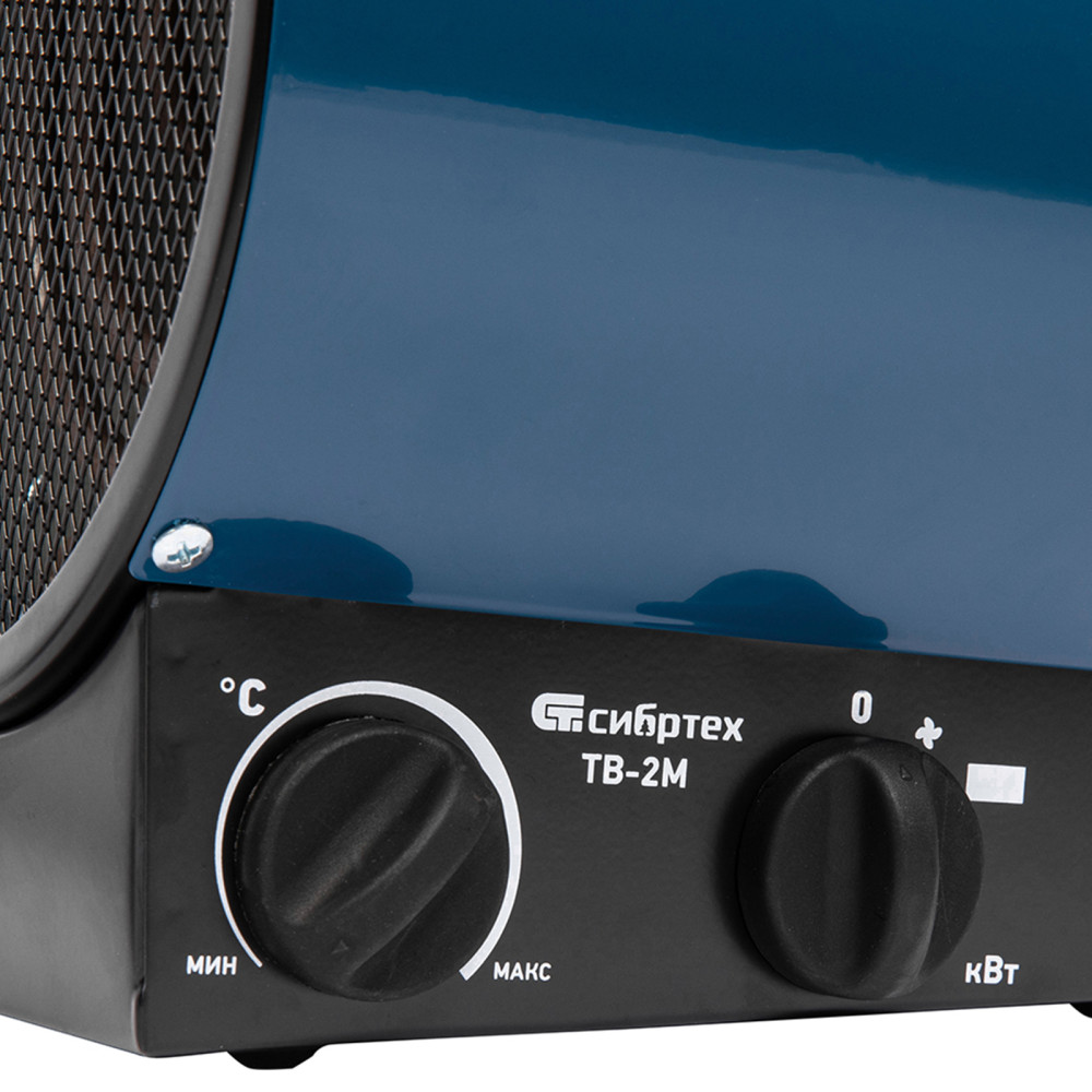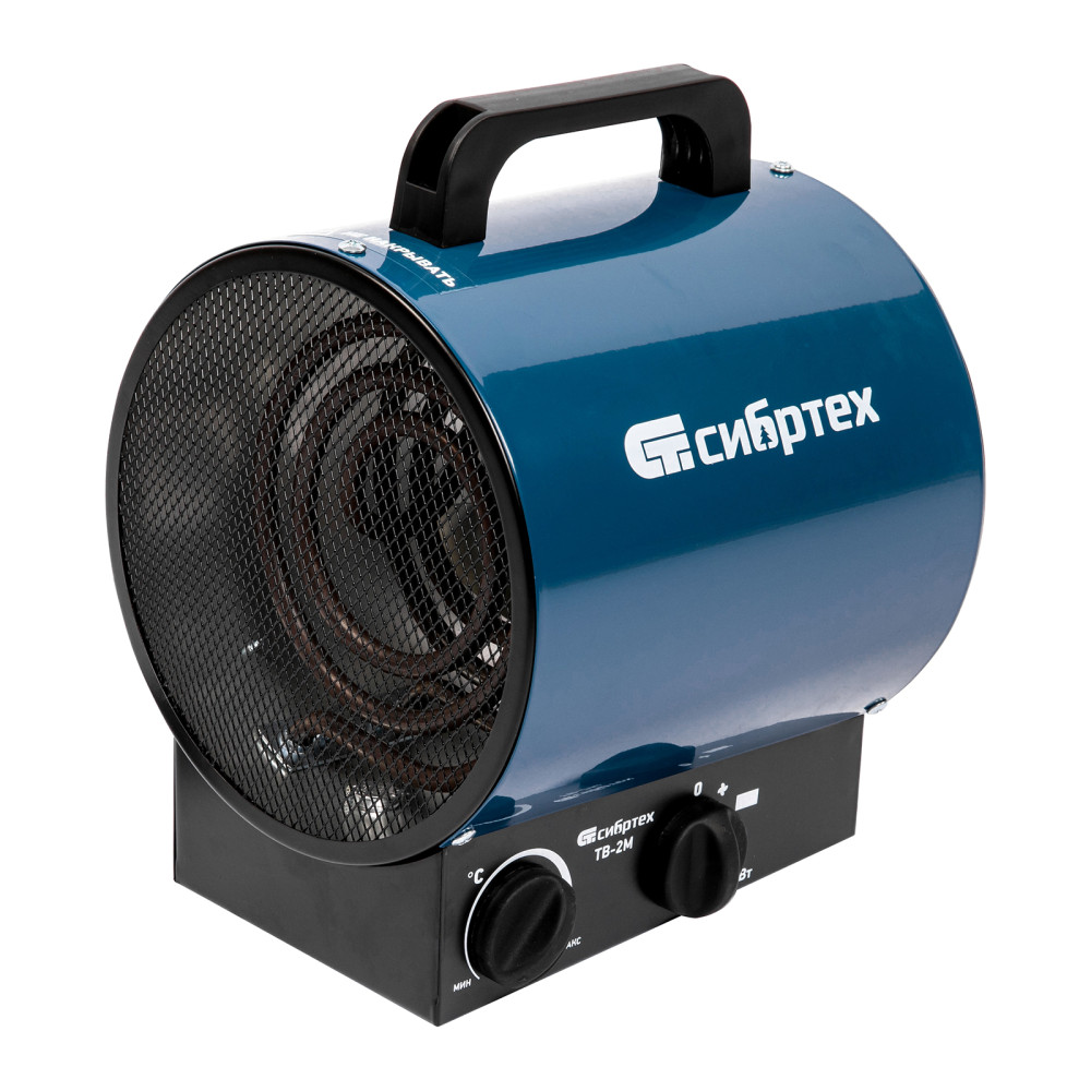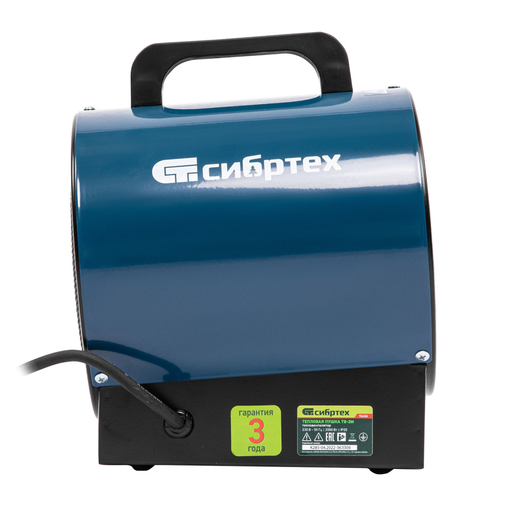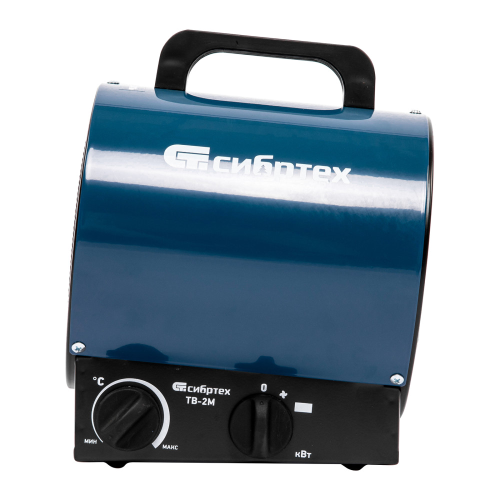 Тепловая пушка (тепловентилятор) Сибртех ТВ-2М 96436 питается от сети 230 В и работает 2 режимах: вентилятор и нагрев на мощности 2000 Вт. В короткие сроки прогревает даже неотапливаемые помещения: бытовые, производственные, подсобные и т.д. В цилиндрический корпус встроен круглый ТЭН, который обеспечивает эффективный теплообмен и практически мгновенно выходит на заданную температуру. Благодаря цилиндрической форме тепловентилятор формирует направленный поток воздуха. Подходит для помещений площадью до 20 кв. м, а также точечного прогрева поверхностей.