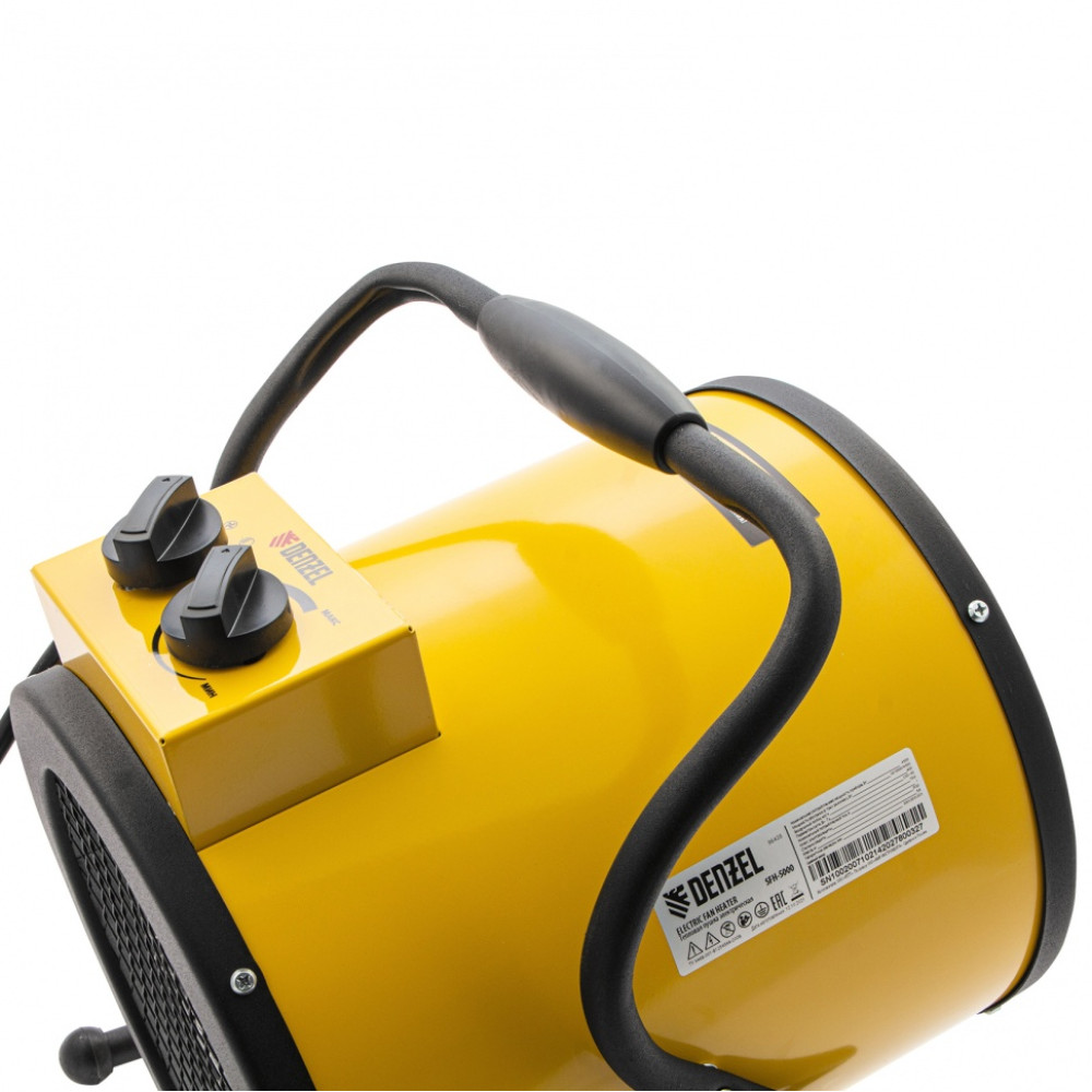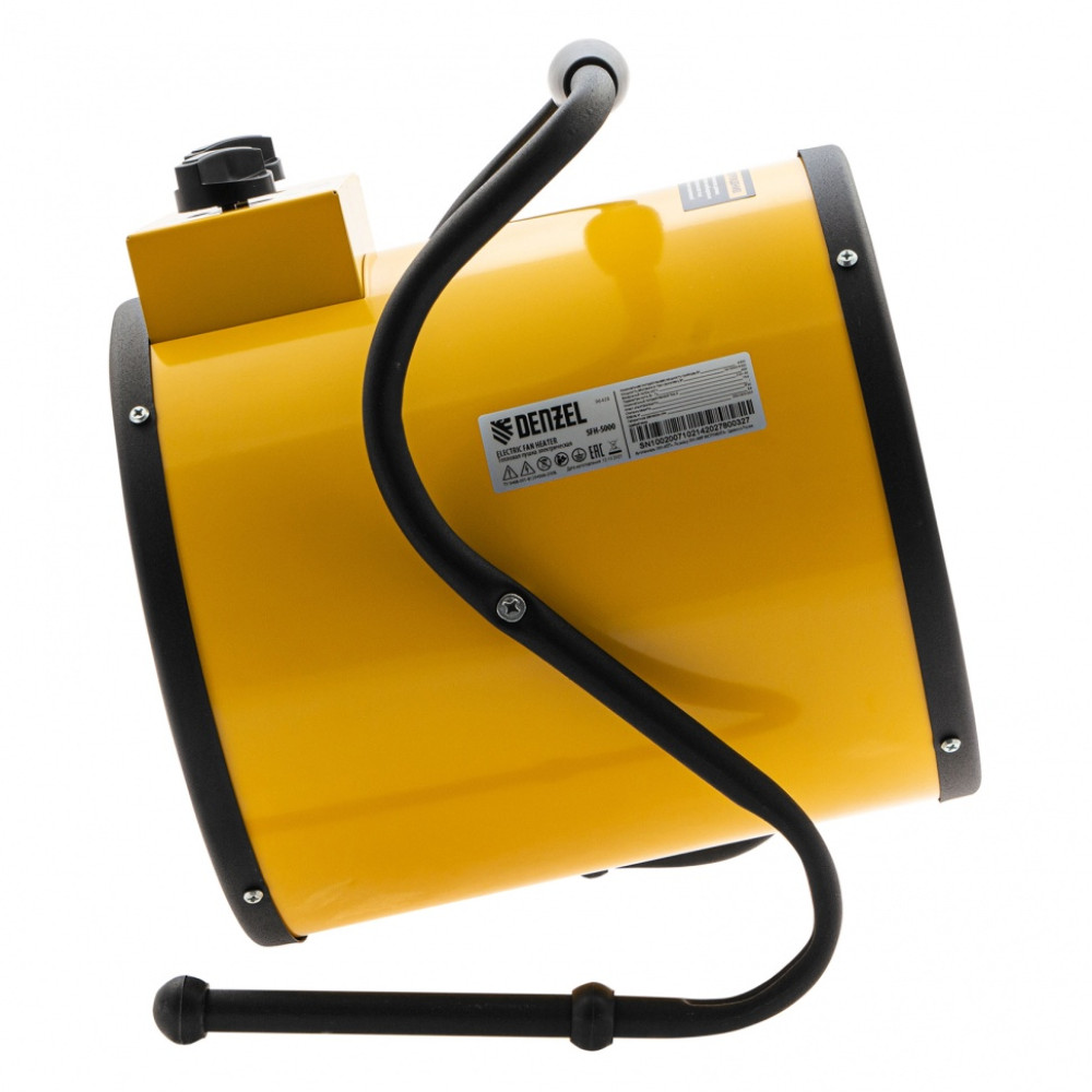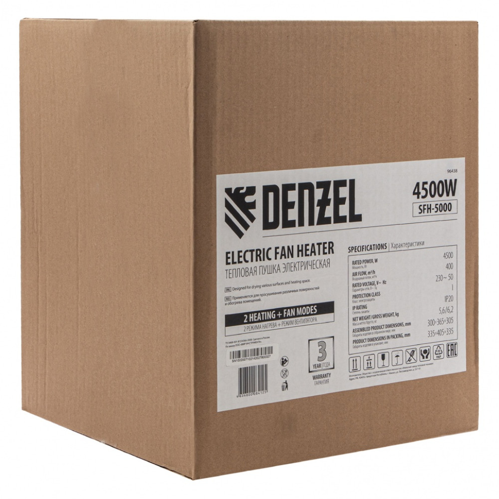 Тепловая пушка профессиональной серии Denzel SFH-5000 96438 питается от сети 230 В, генерирует воздушный поток мощностью 400 куб. м/ ч и работает в одном из трех режимов: вентилятор и нагрев 3000/4500 Вт. Предназначена для обогрева или вентиляции складских, производственных, общественных помещений площадью до 45 кв. м. Может использоваться для дистанционной просушки поверхностей, например, окрашенных или оштукатуренных стен во время отделочных работ.