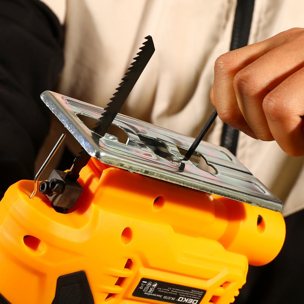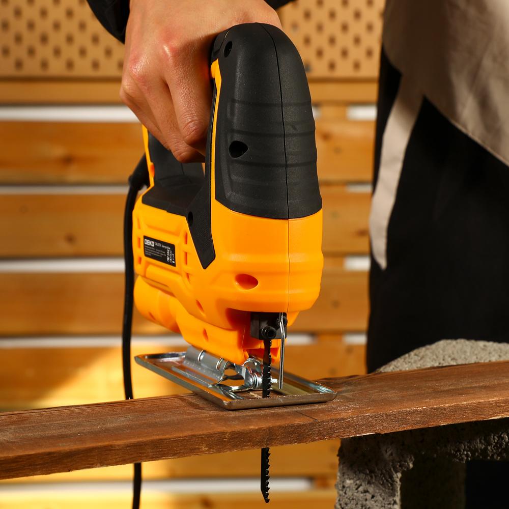- Электролобзик DEKO DKJS700E используется для распиливания дерева, металла, пластика, резины при отделочных или ремонтных работах.