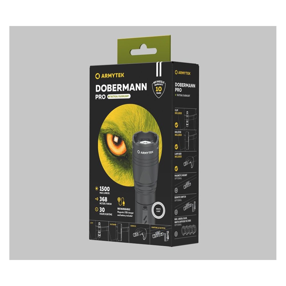 Dobermann Pro — это модель с узким углом света и плавным переходом между центральным пятном и боковой засветкой. Сочетание компактного корпуса и впечатляющих характеристик светового потока делает Dobermann Pro фонарем 2 в 1 для тактического использования и на каждый день.