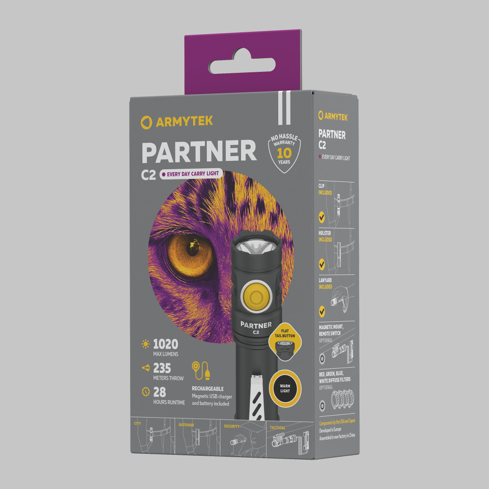 Универсальный помощник дома, в походе или на рыбалке, Partner C2 способен заменить более габаритную тактическую модель на охоте или при патрулировании территории охраняемого объекта. Корпус классического форм-фактора оборудован двумя кнопками управления: плоская тактическая кнопка позволяет быстро включать и выключать фонарь в тактическом хвате, а большая боковая кнопка переключает режимы. Как и модели тактической линейки Armytek, Partner C2 имеет возможность постоянного и мгновенного включения (полунажатием на время удержания тактической кнопки). Комплектация фонаря включает нейлоновый чехол, стальную клипсу и ремешок на руку из паракорда, что обеспечивает удобную фиксацию фонаря на ремне, одежде или снаряжении. Фонарь совместим с опциональными аксессуарами: с подствольными креплениями и цветными фильтрами для тактического использования, а также с велокреплением ABM-01 для велопрогулок.