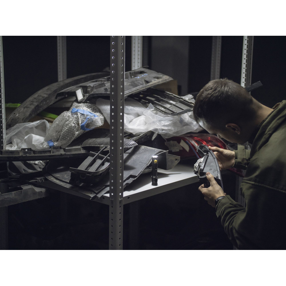 - Плоская тактическая кнопка: предотвращает случайное включение и обеспечивает возможность вертикальной установки. Включение и выключение фонаря в тактическом хвате, уникальный интегрированный магнитный зарядный порт.