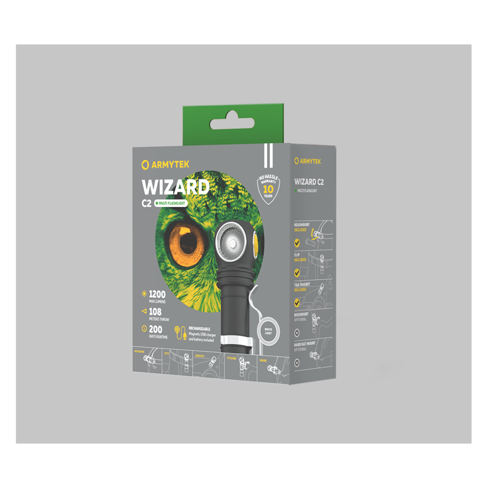 Яркость света данной модели достигает 1200 люмен на расстоянии до 108 метров. Аккумулятор 18650 Li-Ion емкостью 3200 мАч заряжается в фонаре с использованием специального магнитного USB-кабеля. Универсальным Wizard C2 делает возможность нескольких вариантов фиксации: на металлических поверхностях благодаря магниту в задней крышке, на одежде, ремне или сумке с помощью клипсы, на голове в паре с комфортным налобным креплением.
