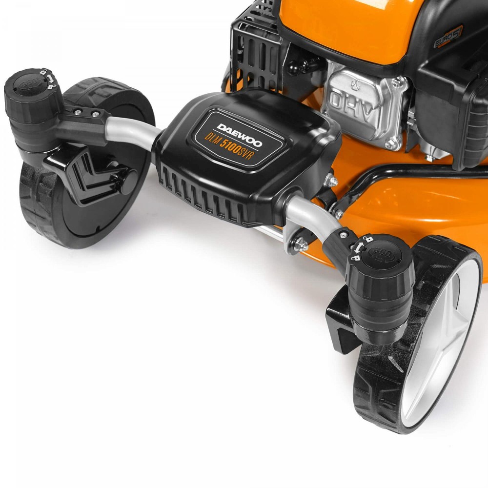 - Центральная регулировка высота среза. Настройка режущей деки производится в одно движение - путем смещения удобно расположенного рычага, который одновременно изменяет высоту подъема передних и задних колес.