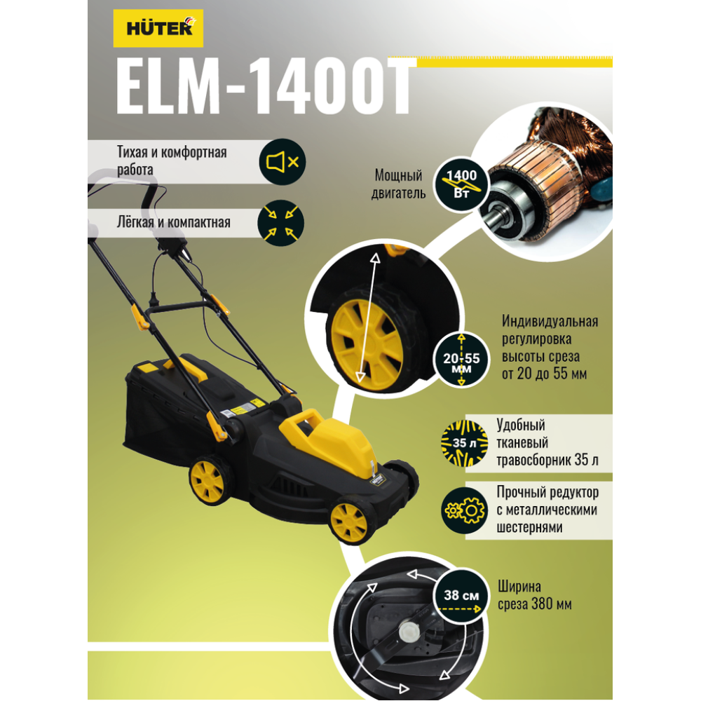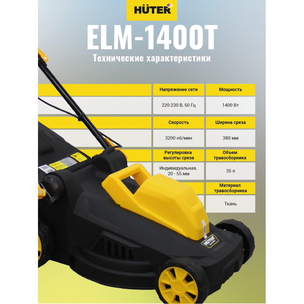 - HUTER ELM-1400T - манёвренная, лёгкая, простая в обслуживании электрическая газонокосилка с большим ресурсом работы. Предназначена для быстрого, качественного среза травы на дачном и придомовом участке. Ширина обрабатываемой области за один проход - 38 см.