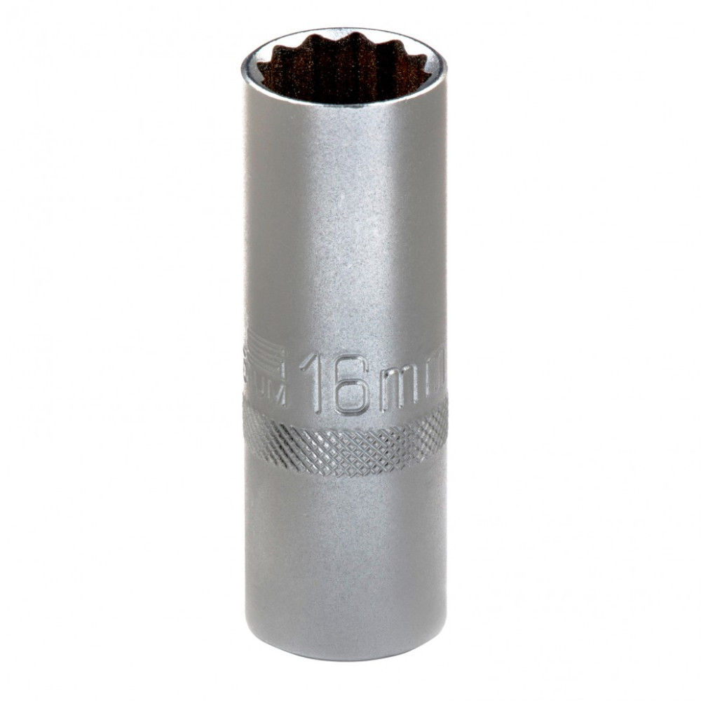 Торцевая 12-гранная свечная головка Stels 13636 размером 16 мм, под квадрат 1/2 дюйма, используется для монтажа и демонтажа свечей зажигания в авто. Резиновая вставка внутри профиля позволяет удерживать свечу при демонтаже, облегчая ее извлечение из корпуса двигателя.