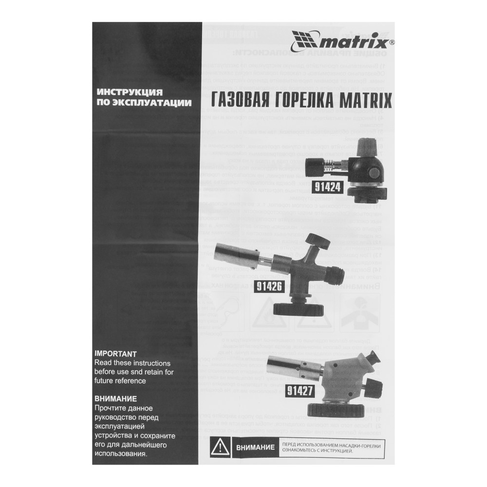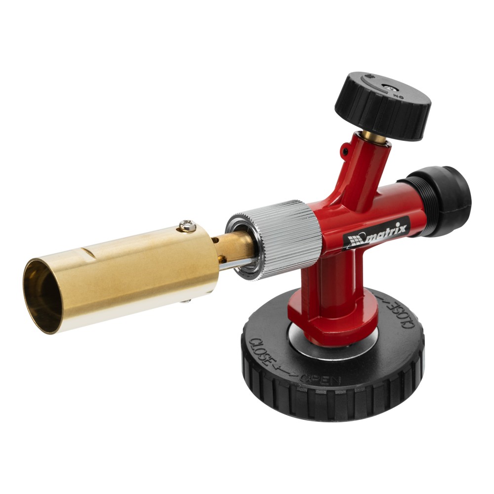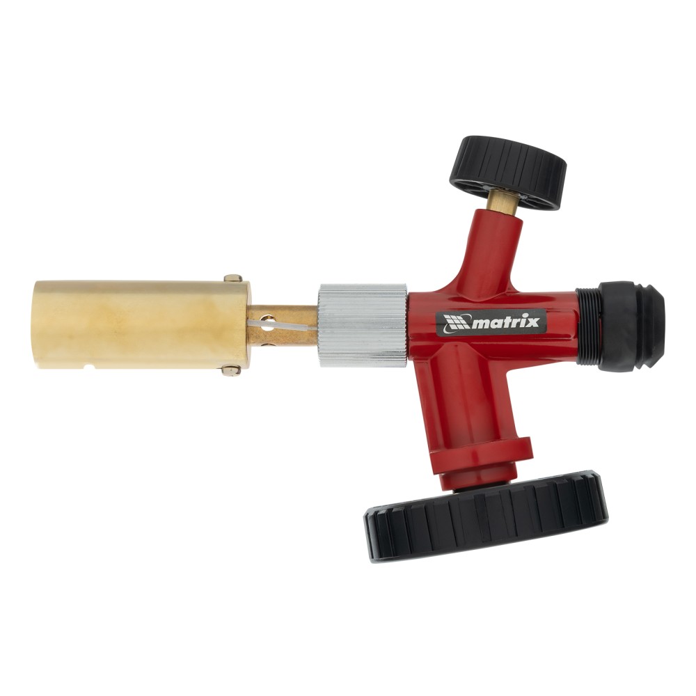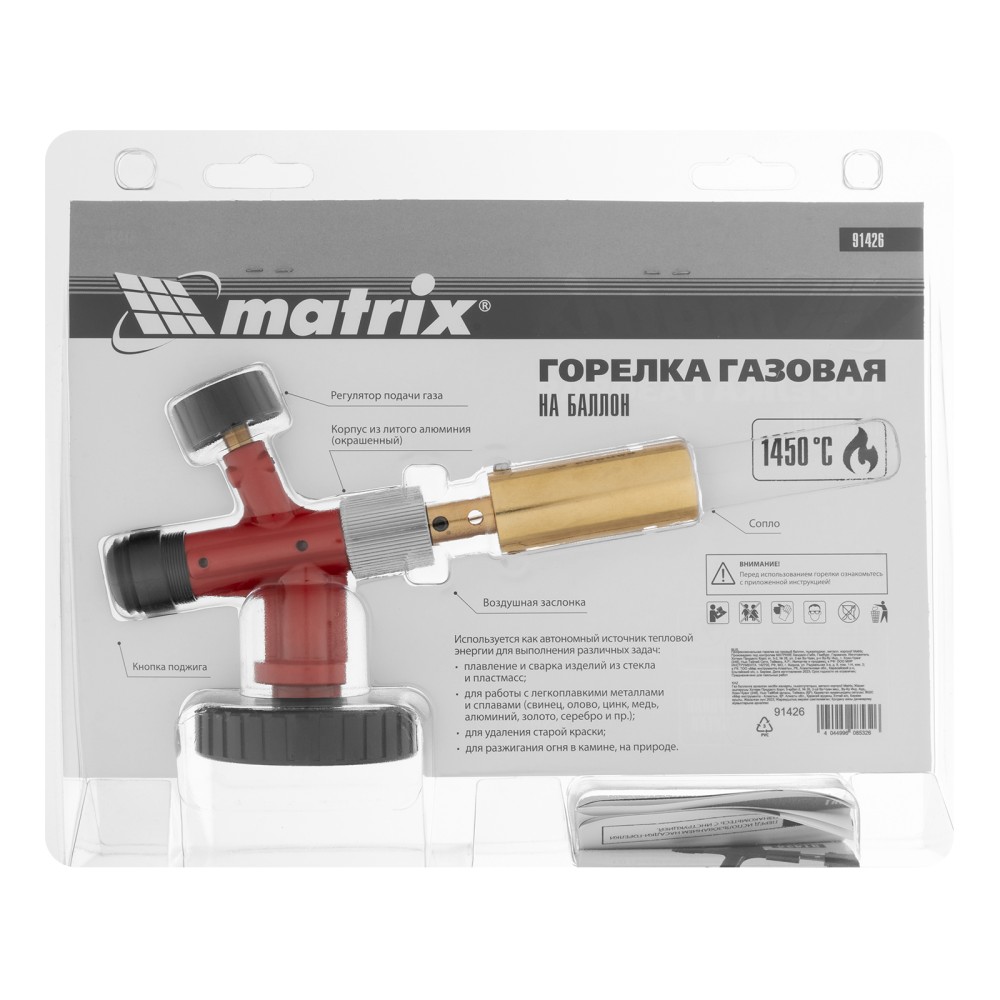Горелка на бутановый баллон Matrix 91426 с пьезоподжигом предназначена для профессионального использования и применяется для нагрева и пайки деталей. Температура пламени достигает 1450 °С, что позволяет эффективно решать поставленные задачи. Горелка будет полезна в автомастерской, а также дома, на даче или в походе. ПреимуществаНадежность — прочный металлический корпус выдерживает длительное использование.Быстрая установка — благодаря цанговому зажиму горелка надежно фиксируется на большинстве газовых баллонов (пропан/бутан).Простое использование — поворотная ручка позволяет регулировать мощность пламени, пьезоподжиг избавляет от необходимости пользоваться зажигалкой или спичками.Функциональность — горелка эффективно работает в наклонном положении под любым углом.