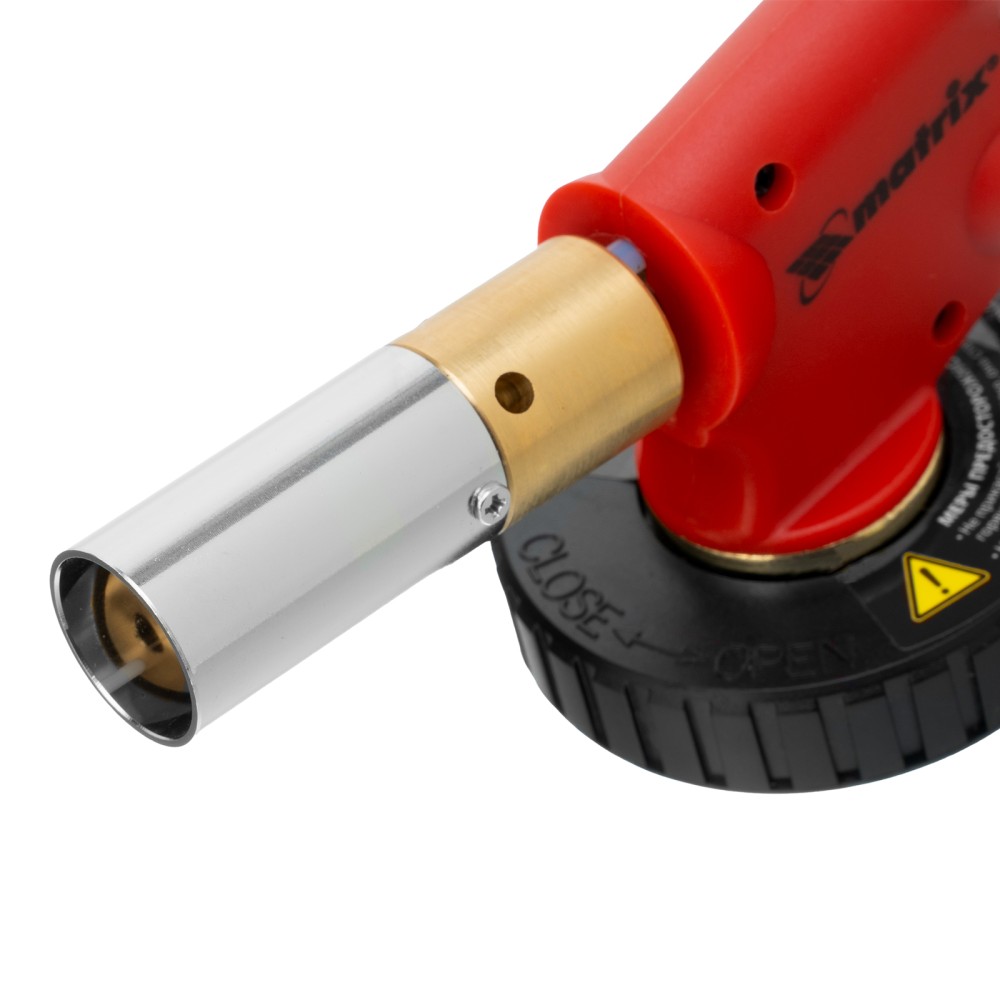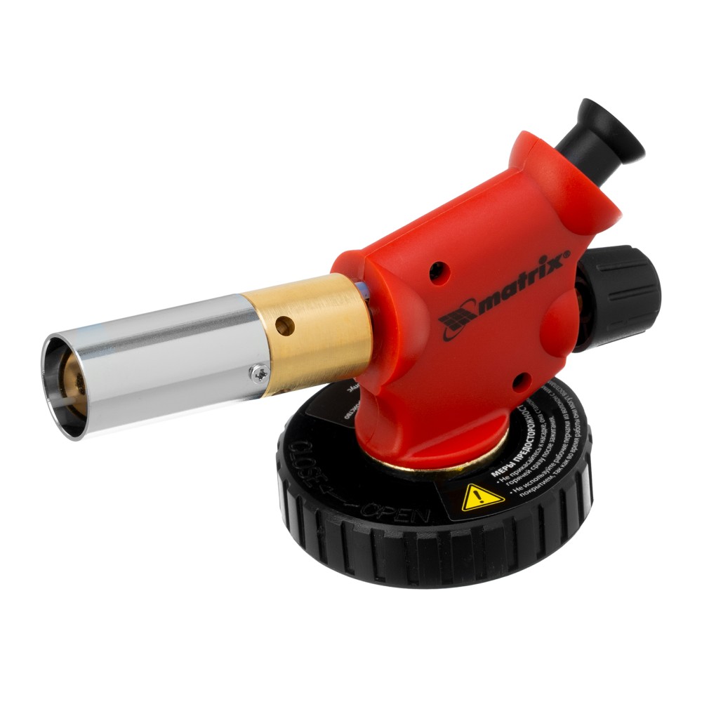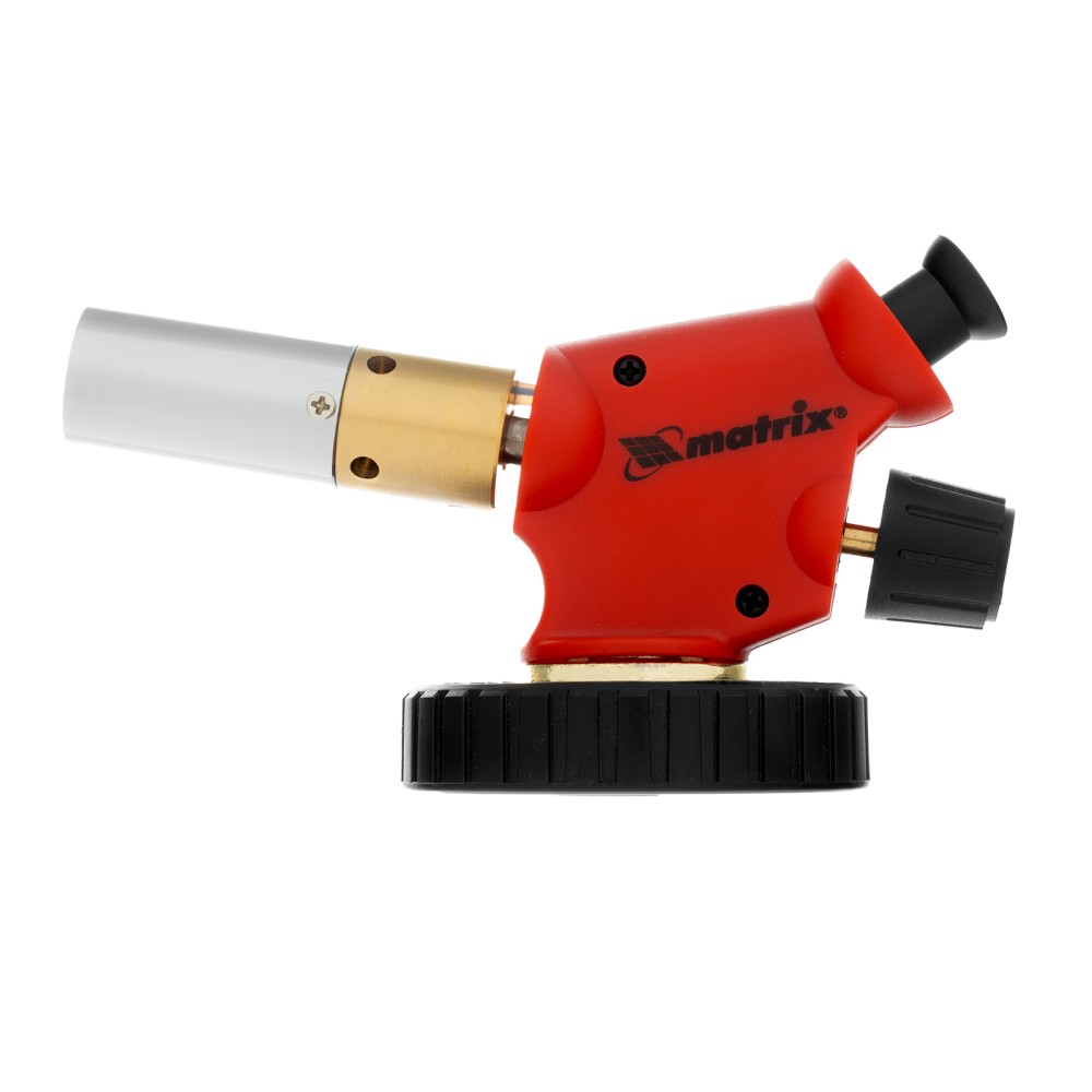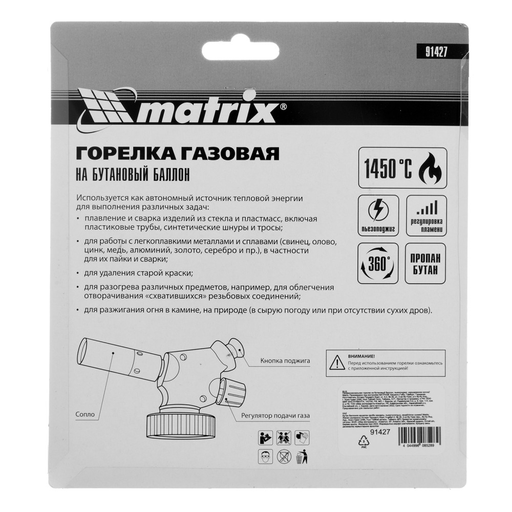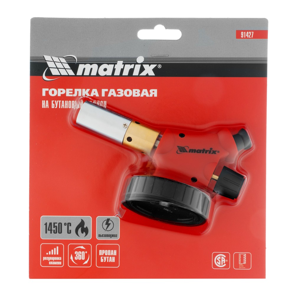 Горелка на бутановый баллон Matrix 91427 с пьезоподжигом предназначена для профессионального использования и применяется для нагрева и пайки деталей. Температура пламени достигает 1450 °С, что позволяет эффективно решать поставленные задачи. Горелка будет полезна в автомастерской, а также дома, на даче или в походе. ПреимуществаБыстрая установка — благодаря цанговому зажиму горелка надежно фиксируется на большинстве газовых баллонов (пропан/бутан).Простое использование — поворотная ручка позволяет регулировать мощность пламени, пьезоподжиг избавляет от необходимости пользоваться зажигалкой или спичками.Функциональность — горелка эффективно работает в наклонном положении под любым углом.
