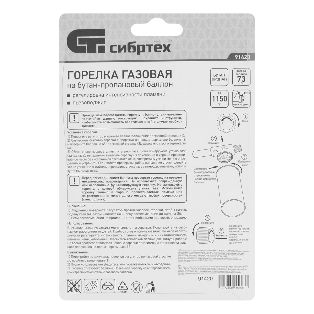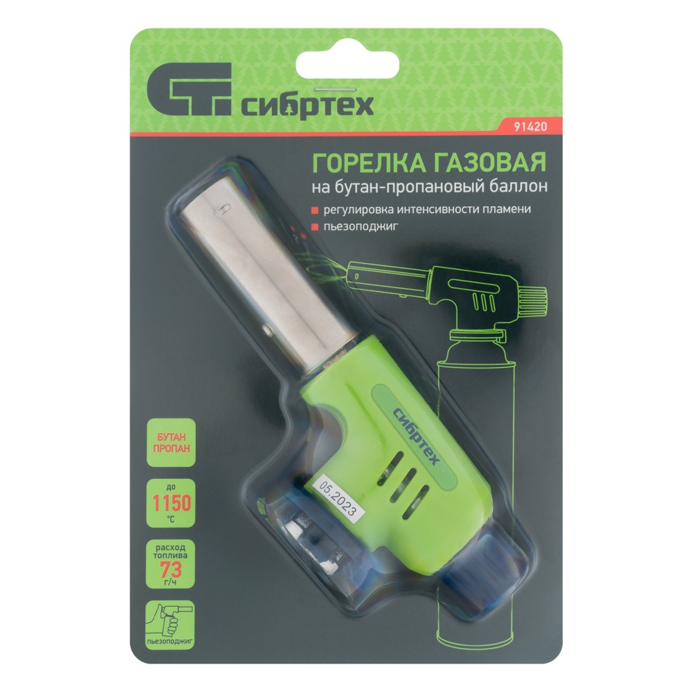 Газовая горелка Сибртех 91420 с пьезоподжигом предназначена для установки на бутановый баллон. Позволяет развести огонь без применения химических средств, нагреть замерзшие детали или пластиковые поверхности для сгибания, а также спаять медные трубы. Горелка пригодится в домашнем хозяйстве, в походе или на даче, а также будет полезна во время ремонта автомобиля. ПреимуществаПростое использование — пьезоподжиг приводит горелку в рабочее состояние за пару секунд.Регулировка подачи газа — можно устанавливать мощность пламени в соответствии с поставленными задачами.Удобное приобретение расходников — горелка устанавливается на стандартный бутан-пропановый баллон.