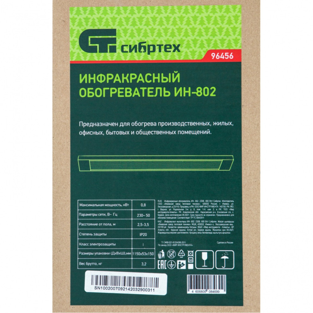 Инфракрасный обогреватель Сибртех ИН-802 96456 подключается к сети 230 В, потребляет мощность до 800 Вт и предназначен для создания комфортных температурных условий в помещении в холодное время года. Служит основным источником тепла на площади до 8 кв. м и дополнительным — в помещениях до 16 кв. м.