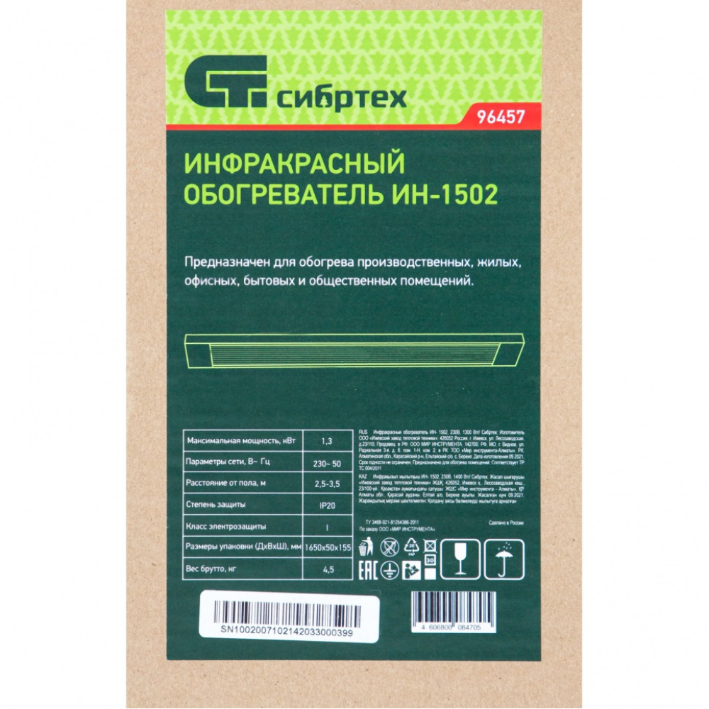 Инфракрасный обогреватель Сибртех ИН-1502 96457 подключается к сети 230 В, потребляет мощность до 1400 Вт и предназначен для создания комфортных температурных условий в помещении в холодное время года. Служит основным источником тепла на площади до 13 кв. м и дополнительным — в помещениях до 26 кв. м.