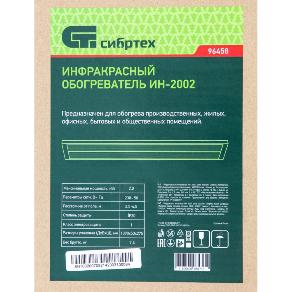 Инфракрасный обогреватель Сибртех ИН-2002 96458 подключается к сети 230 В, потребляет мощность до 2000 Вт и предназначен для создания комфортных температурных условий в помещении в холодное время года. Служит основным источником тепла на площади до 20 кв. м и дополнительным — в помещениях до 40 кв. м.