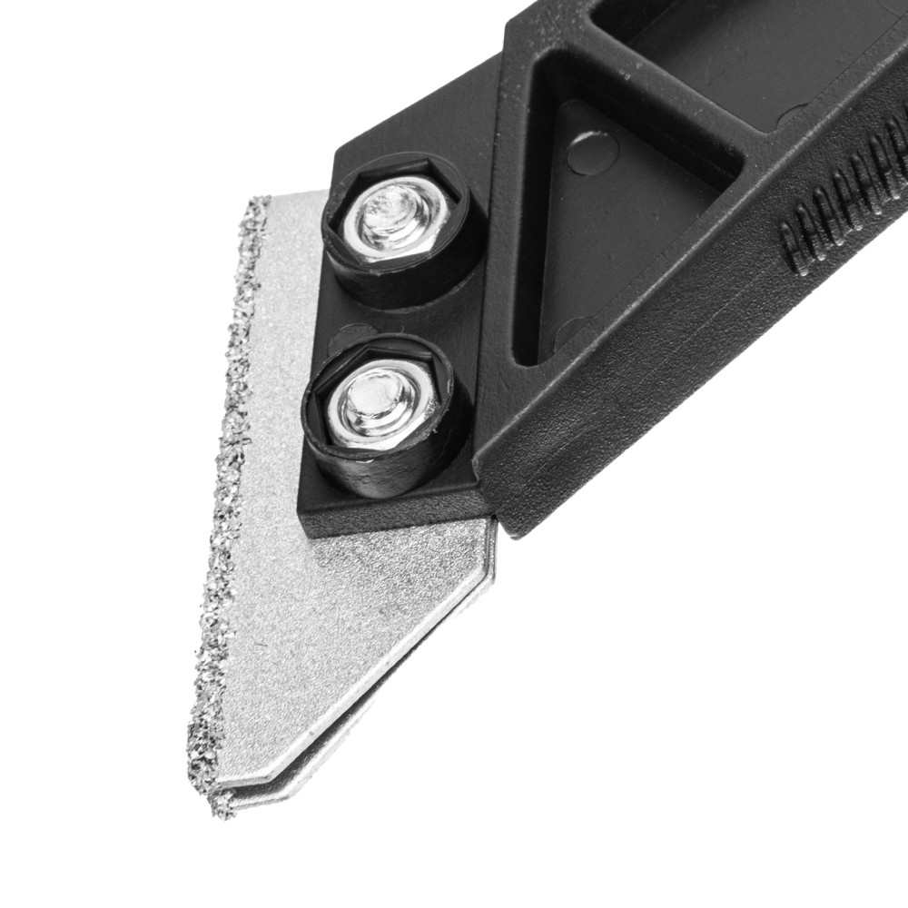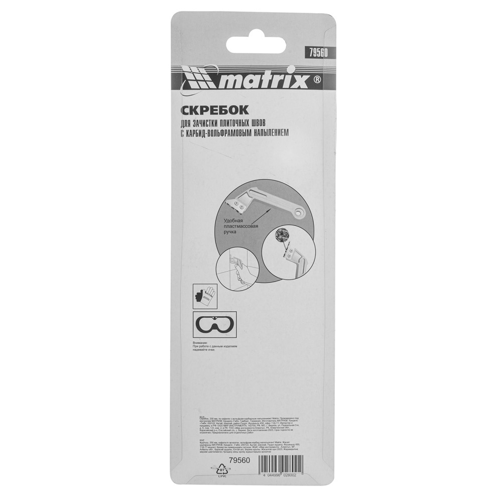 Скребок по кафелю Matrix 79560 длиной 250 мм, с вольфрам-карбидным напылением, используется для затирки швов между плитками, удаления и выравнивания герметика и силикона, а также для снятия обоев и старой краски. Пригодится для работы с кафелем, стеклом и керамикой, подходит для бытового и профессионального применения.ПреимуществаДолговечность — пластиковый корпус характеризуется повышенной прочностью.Высокий ресурс — лезвие из углеродистой стали с вольфрам-карбидным напылением обладает повышенной износостойкостью.Комфортная работа в труднодоступных местах — корпус имеет угловую форму.Надежная конструкция — лезвие надежно крепится к корпусу при помощи двух винтов.Удобная эксплуатация — рельефная пластиковая рукоятка не выскальзывает из ладони.Удобное хранение — отверстие в рукоятке позволяет подвешивать скребок на крючок или гвоздь.