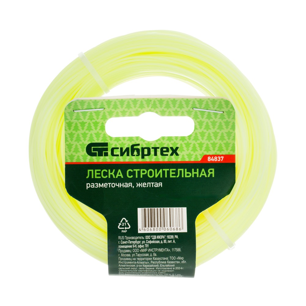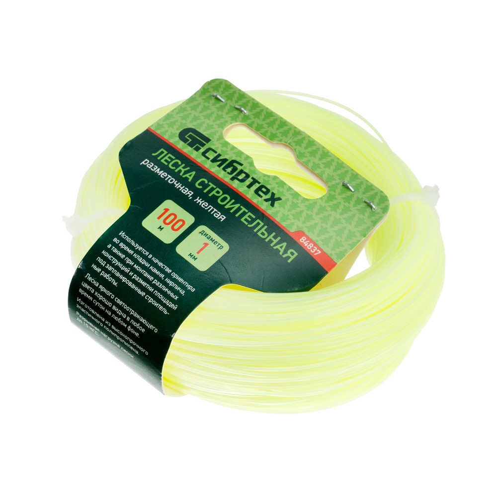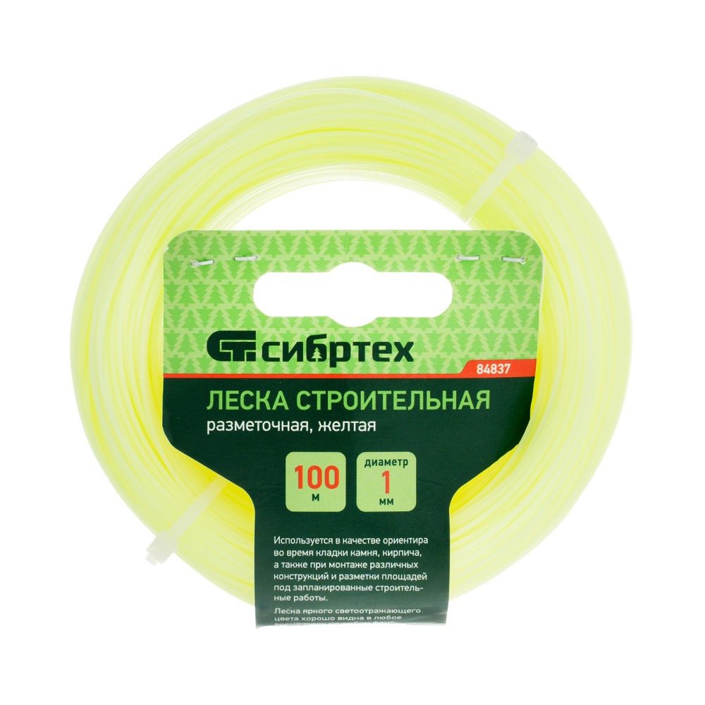 Леска строительная Сибртех 84837, длина 100 м, диаметр 1 мм, желтого цвета, пригодится на строительной площадке как ориентир при укладке материалов, установке конструкций. Также она будет полезна для садоводов для разметки территории. Если леску натянуть, то получается идеально ровная линия, что повышает точность работы, а также позволяет проводить замеры с ее помощью.ПреимуществаЛеска выполнена из высокопрочного и эластичного полипропилена, поэтому не растягивается, не загрязняется, а также выдерживает разрывные нагрузки до 15 КГС.Желтая светоотражающая леска хорошо видна даже в темное время суток.100 м лески хватит на большой объем работ.