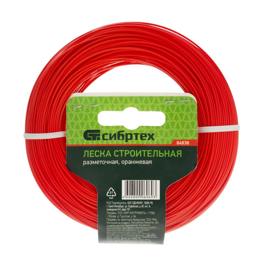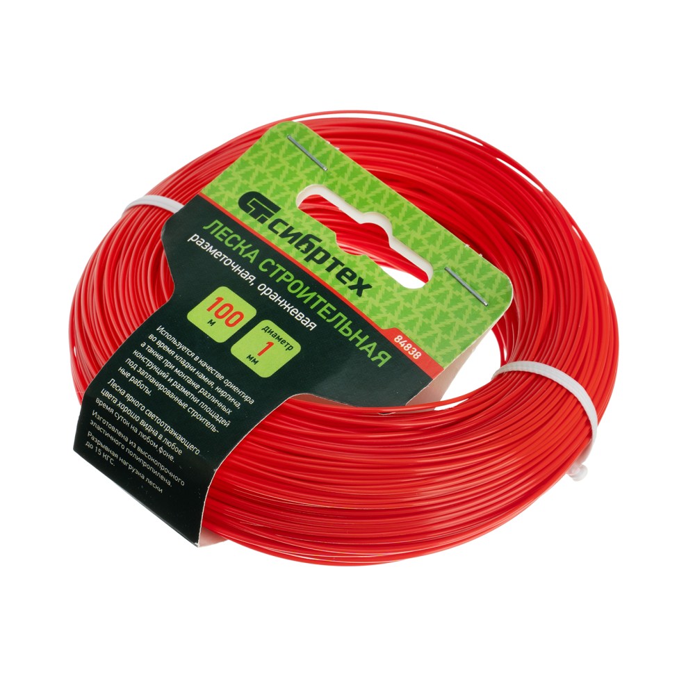 Леска строительная Сибртех 84838, длина 100 м, диаметр 1 мм, оранжевого цвета, пригодится на строительной площадке как ориентир при укладке материалов, установке конструкций. Также она будет полезна для садоводов для разметки территории. Если леску натянуть, то получается идеально ровная линия, что повышает точность работы, а также позволяет проводить замеры с ее помощью.ПреимуществаЛеска выполнена из высокопрочного и эластичного полипропилена, поэтому не растягивается, не загрязняется, а также выдерживает разрывные нагрузки до 15 КГС.Оранжевая светоотражающая леска хорошо видна даже в темное время суток.100 м лески хватит на большой объем работ.