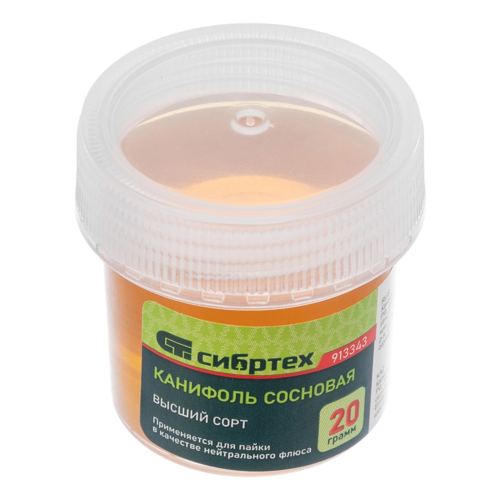 Канифоль высшего качества Сибртех 913343 в банке объемом 20 г, изготовленная в соответствии с ГОСТ 19113-84, — нейтральный флюс на основе сосновой смолы. Используется для пайки проводов и радиодеталей, а также лужения жала паяльника. Удаляет с металлических поверхностей оксидные пленки и повышает надежность паяного соединения. Пригодится радиолюбителям, а также будет полезна в быту.ПреимуществаУдобная работа в труднодоступных местах — флюс имеет жидкую консистенцию.Объем 20 г — количество канифоли оптимально для выполнения небольшого объема работ.Подтвержденное качество — характеристики паяльного флюса соответствуют ГОСТ 19113-84.