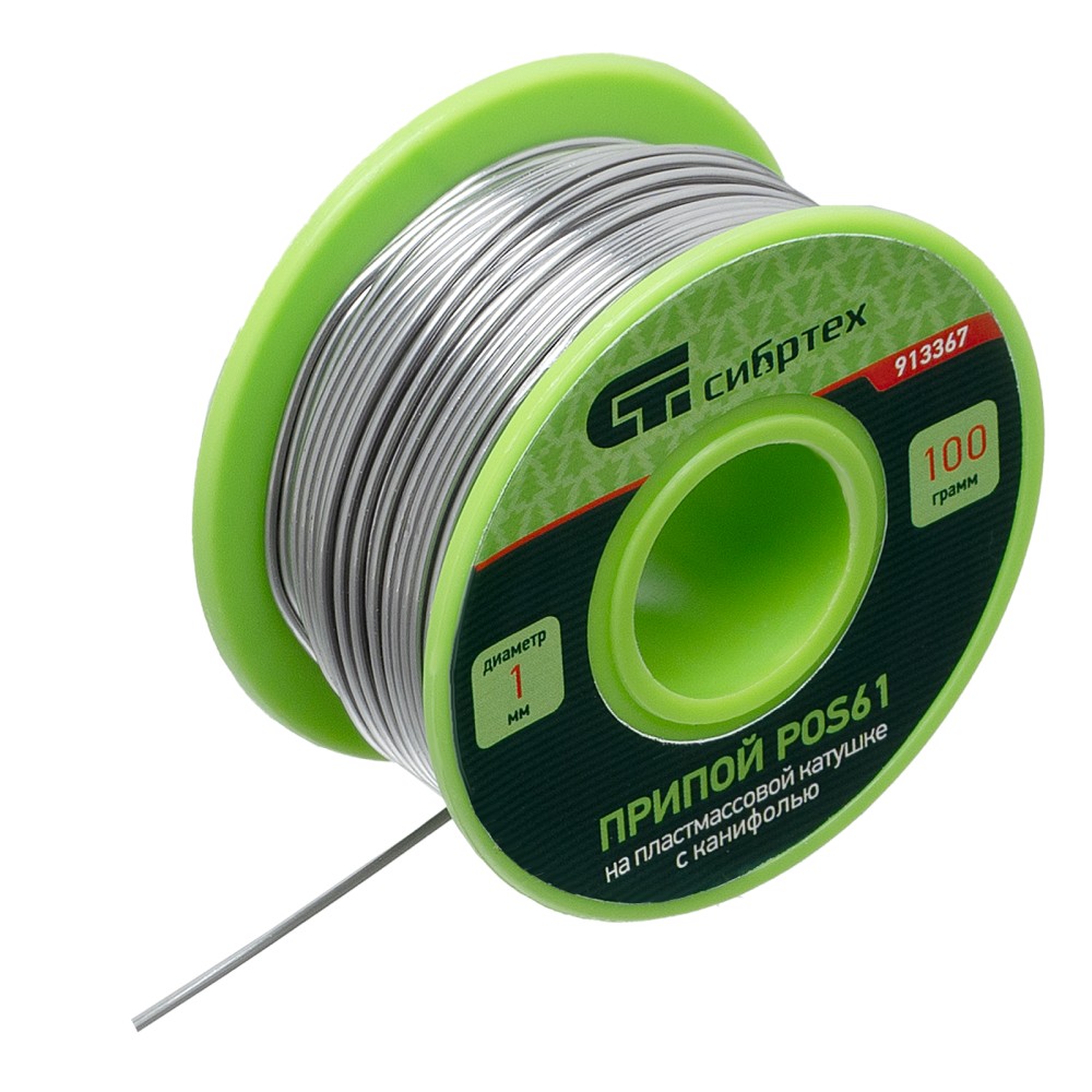 Припой с канифолью POS61 Сибртех 913367 диаметром 1 мм и весом 100 г, на пластмассовой катушке, используется для пайки. Надежно соединяет медные провода, позволяет монтировать транзисторы, предохранители на печатной плате, а также работать с другими легкоплавкими металлическими деталями. Пригодится радиолюбителям и мастерам по ремонту электроники.ПреимуществаЭффективность — припой с канифолью ПОС-61 не требует отдельной обработки деталей флюсом.Пайка чувствительных к перегреву компонентов — благодаря высокому содержанию олова (Sn61% + Pb39%, 61% олова + 39% свинца) припой плавится при температуре 190 ℃.Удобное дозирование — паяльный припой поставляется в виде намотанной на катушку проволоки.