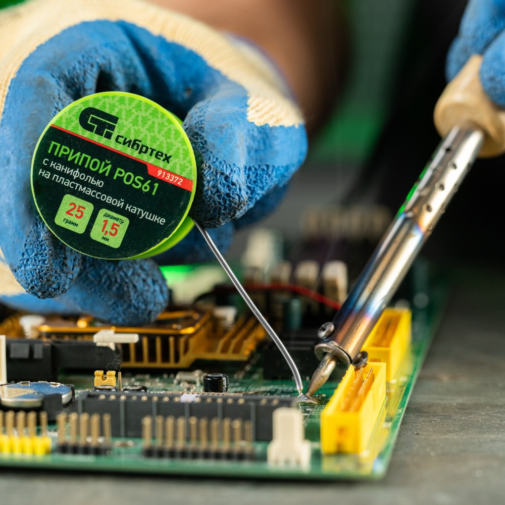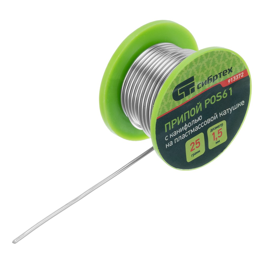 Припой с канифолью POS61 Сибртех 913372 диаметром 1,5 мм и весом 25 г, на пластмассовой катушке, — сплав, использующийся для пайки электронных деталей и проводов. Будет полезен для монтажа и ремонта электронной техники в профессиональной и частной сфере.ПреимуществаЭффективность — припой с канифолью ПОС-61 не требует отдельной обработки деталей флюсом.Пайка чувствительных к перегреву компонентов — благодаря высокому содержанию олова (Sn61% + Pb39%, 61% олова + 39% свинца) припой плавится при температуре 190 ℃.Удобное дозирование — паяльный припой в виде намотанной на катушку проволоки.