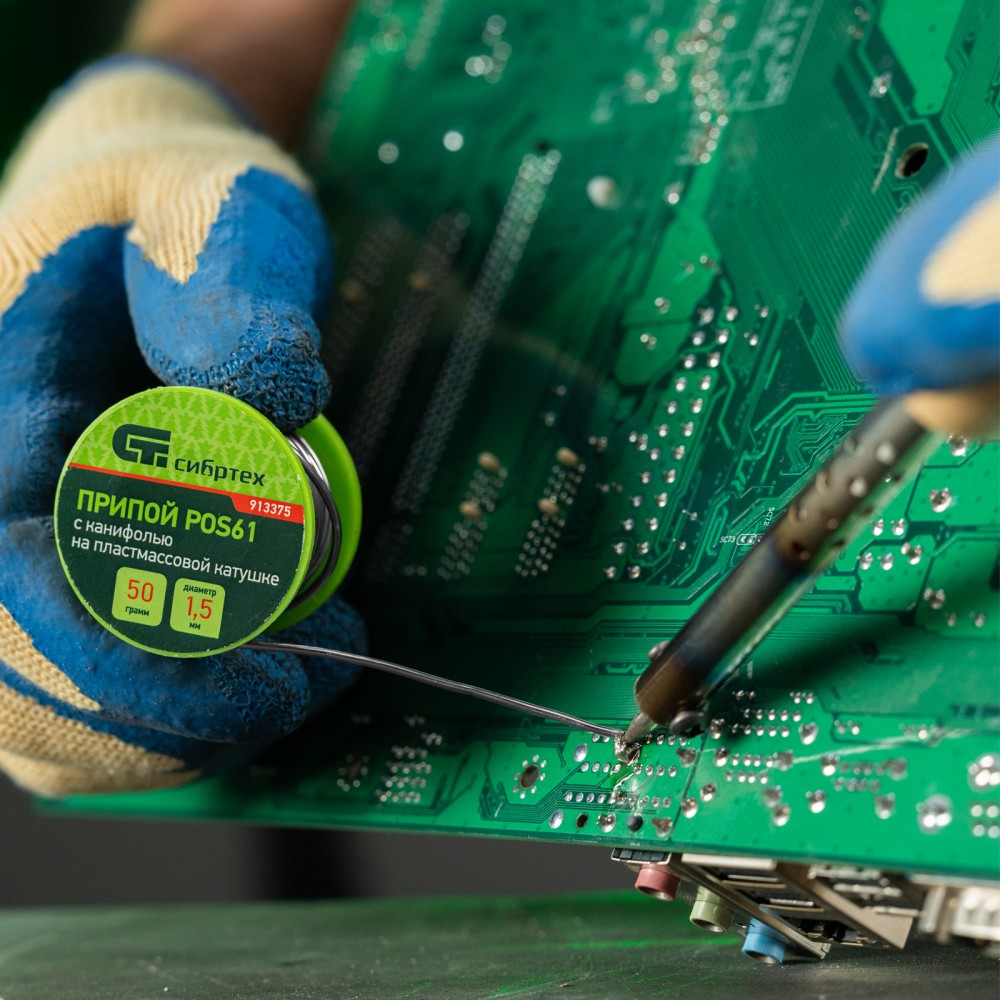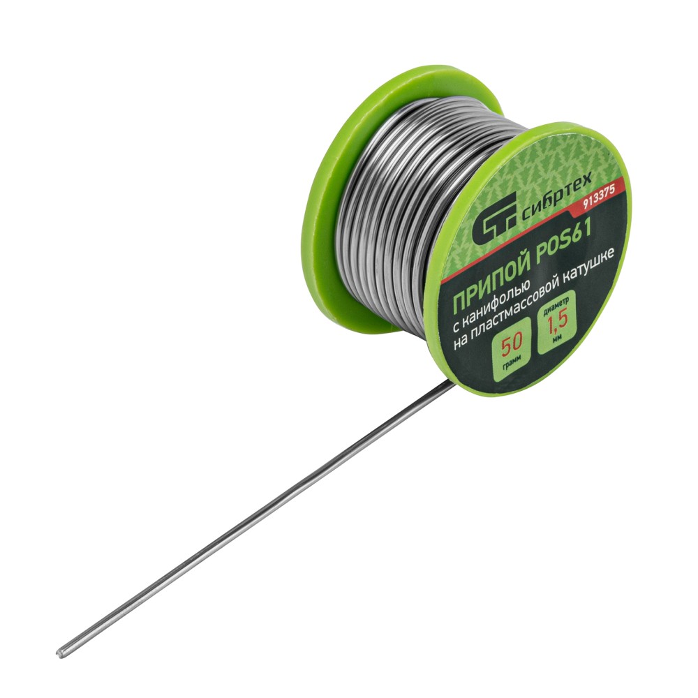 Припой с канифолью POS61 Сибртех 913375 диаметром 1,5 мм и весом 50 г, на пластмассовой катушке, — сплав, использующийся для пайки электронных деталей и проводов. Будет полезен для монтажа и ремонта электронной техники в профессиональной и частной сфере.ПреимуществаЭффективность — припой с канифолью ПОС-61 не требует отдельной обработки деталей флюсом.Пайка чувствительных к перегреву компонентов — благодаря высокому содержанию олова (Sn61% + Pb39%, 61% олова + 39% свинца) припой плавится при температуре 190 ℃.Удобное дозирование — паяльный припой в виде намотанной на катушку проволоки.