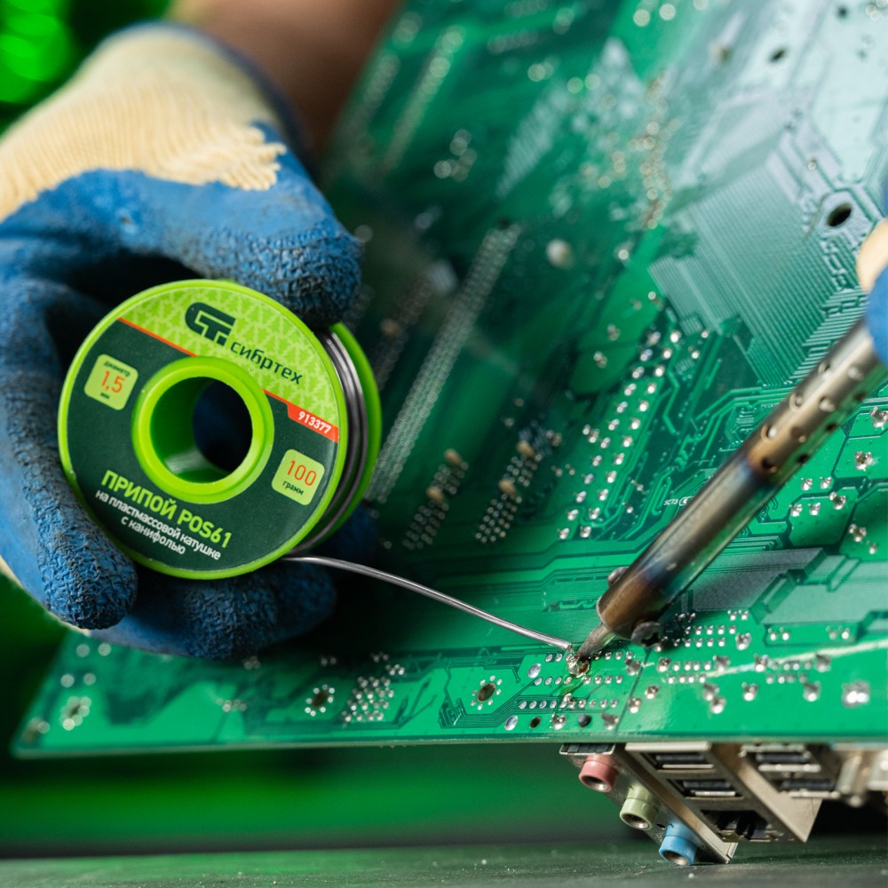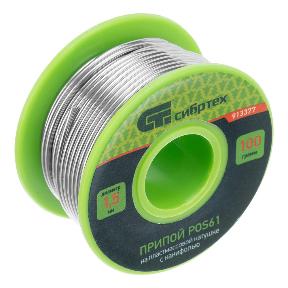 Припой с канифолью POS61 Сибртех 913377 диаметром 1,5 мм и весом 100 г, на пластмассовой катушке, — сплав, использующийся для пайки электронных деталей и проводов. Будет полезен для монтажа и ремонта электронной техники в профессиональной и частной сфере.ПреимуществаЭффективность — припой с канифолью ПОС-61 не требует отдельной обработки деталей флюсом.Пайка чувствительных к перегреву компонентов — благодаря высокому содержанию олова (Sn61% + Pb39%, 61% олова + 39% свинца) припой плавится при температуре 190 ℃.Удобное дозирование — паяльный припой в виде намотанной на катушку проволоки.