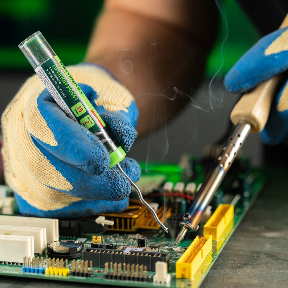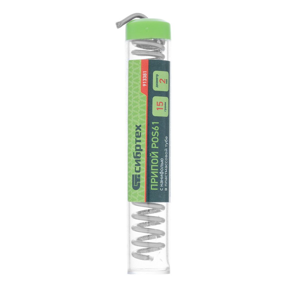 Припой с канифолью POS61 Сибртех 913381 диаметром 2 мм и весом 15 г, в пластмассовой тубе, — материал для пайки, в расплавленном состоянии соединяющий металлические детали. Содержит 39% свинца, 61% олова (Sn61% + Pb39%) и канифоль, не требует очистки припаиваемых поверхностей. Будет полезен для бытового ремонта радиоэлектронной аппаратуры.ПреимуществаФлюс в составе — его не требуется отдельно вносить на участок для пайки.Невысокая температура плавления 190 °C — можно не опасаться перегрева электронных компонентов.Удобное хранение и использование — припой выпускается в форме проволоки, скрученной в спираль и помещенной в пластмассовую тубу.