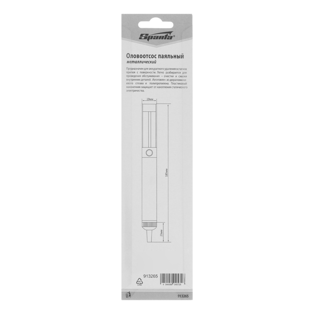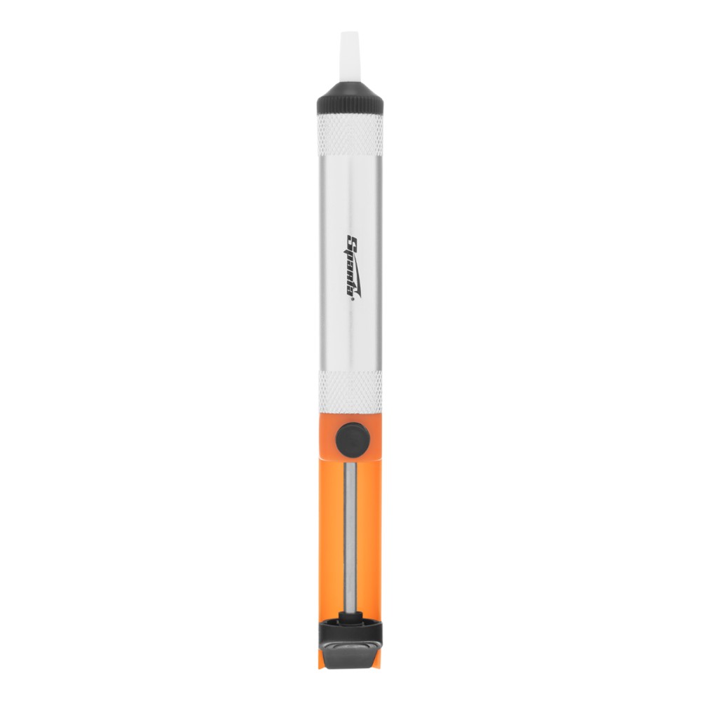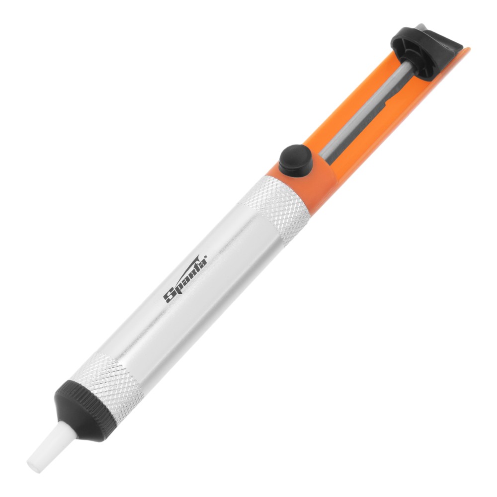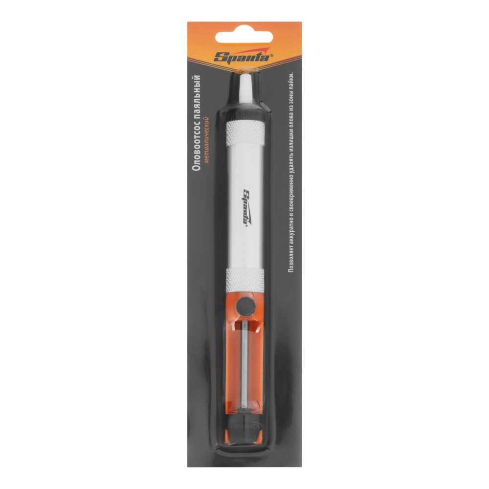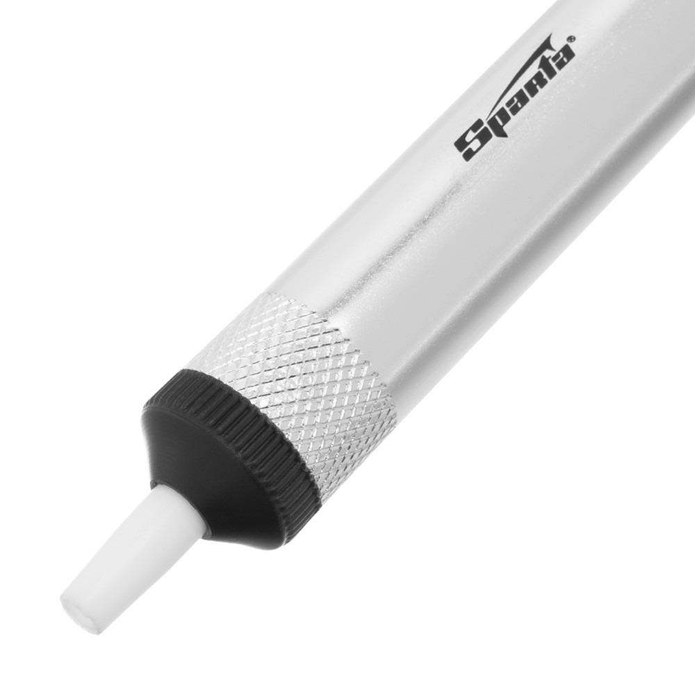 Паяльный металлический оловоотсос Sparta 913265 применяется при работе с микросхемами. Он удаляет остатки припоя и позволяет аккуратно извлекать микросхемы без потери их работоспособности. Ручной инструмент имеет простую конструкцию, удобную в эксплуатации, поэтому пригодится профессионалам и неопытным мастерам.ПреимуществаКорпус выполнен из алюминиевого сплава — прочного и легкого материала, устойчивого к высоким температурам.Оцинкованный металлический шток не подвержен коррозии.Оловоотсос оснащен полипропиленовой накладкой для комфортного использования и надежного удержания.