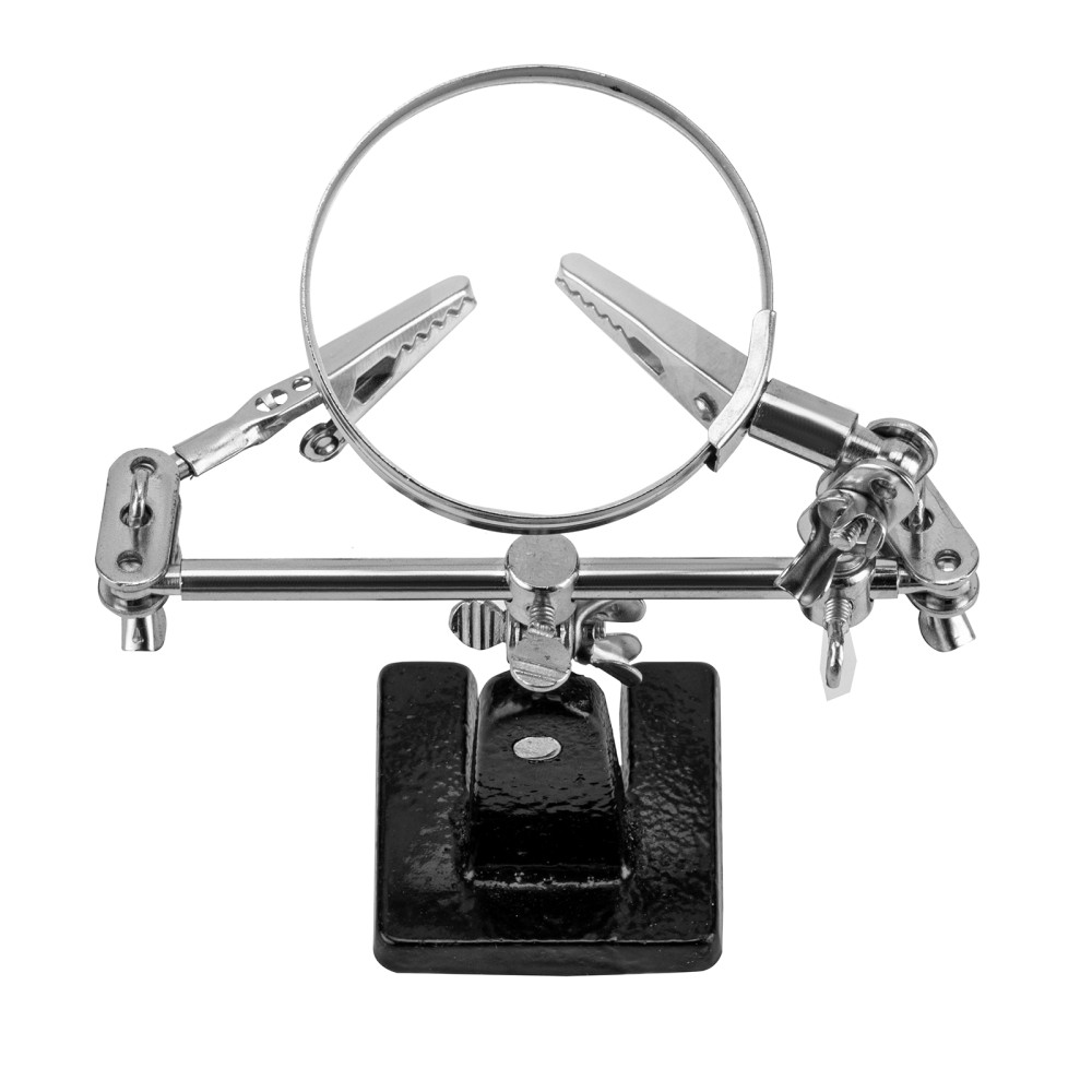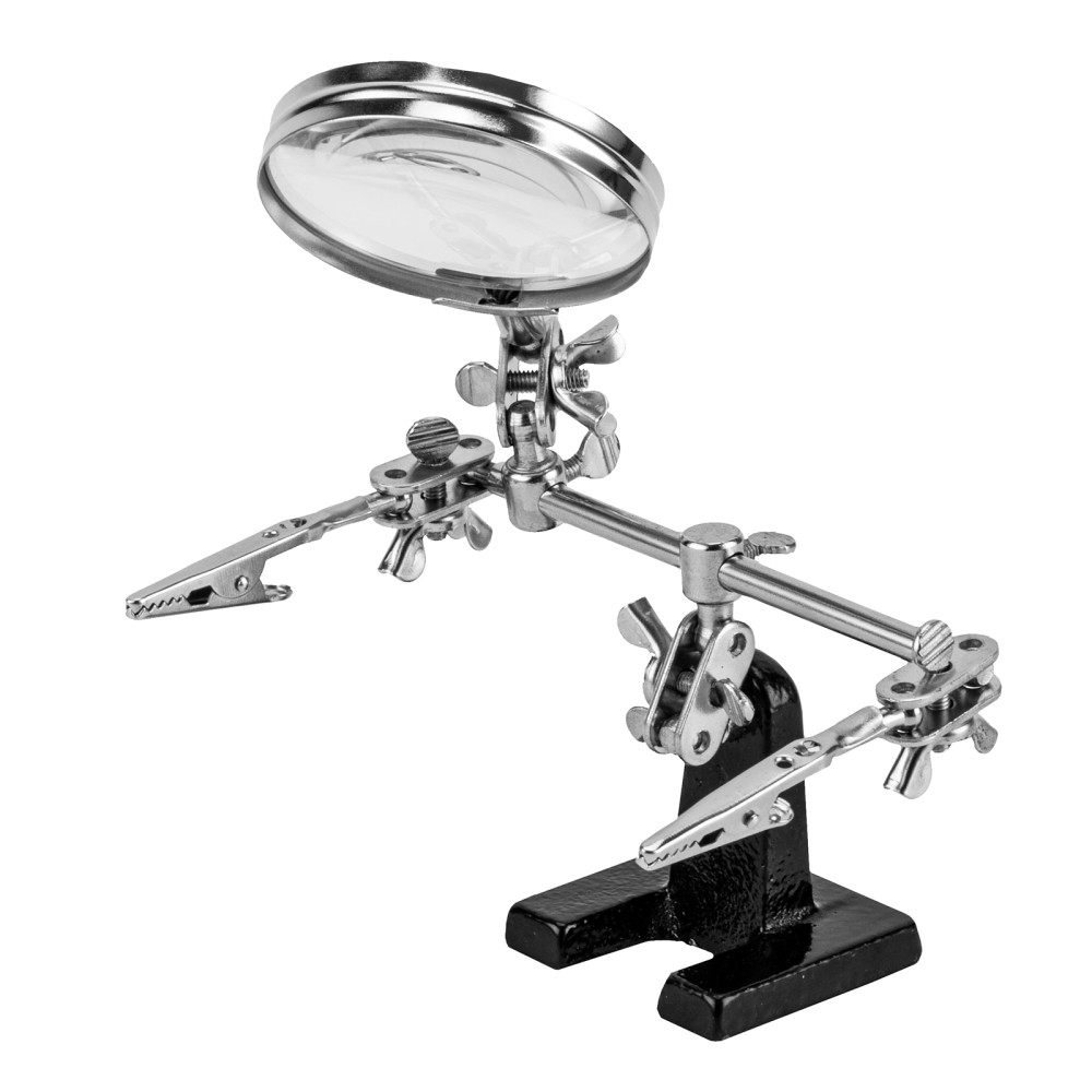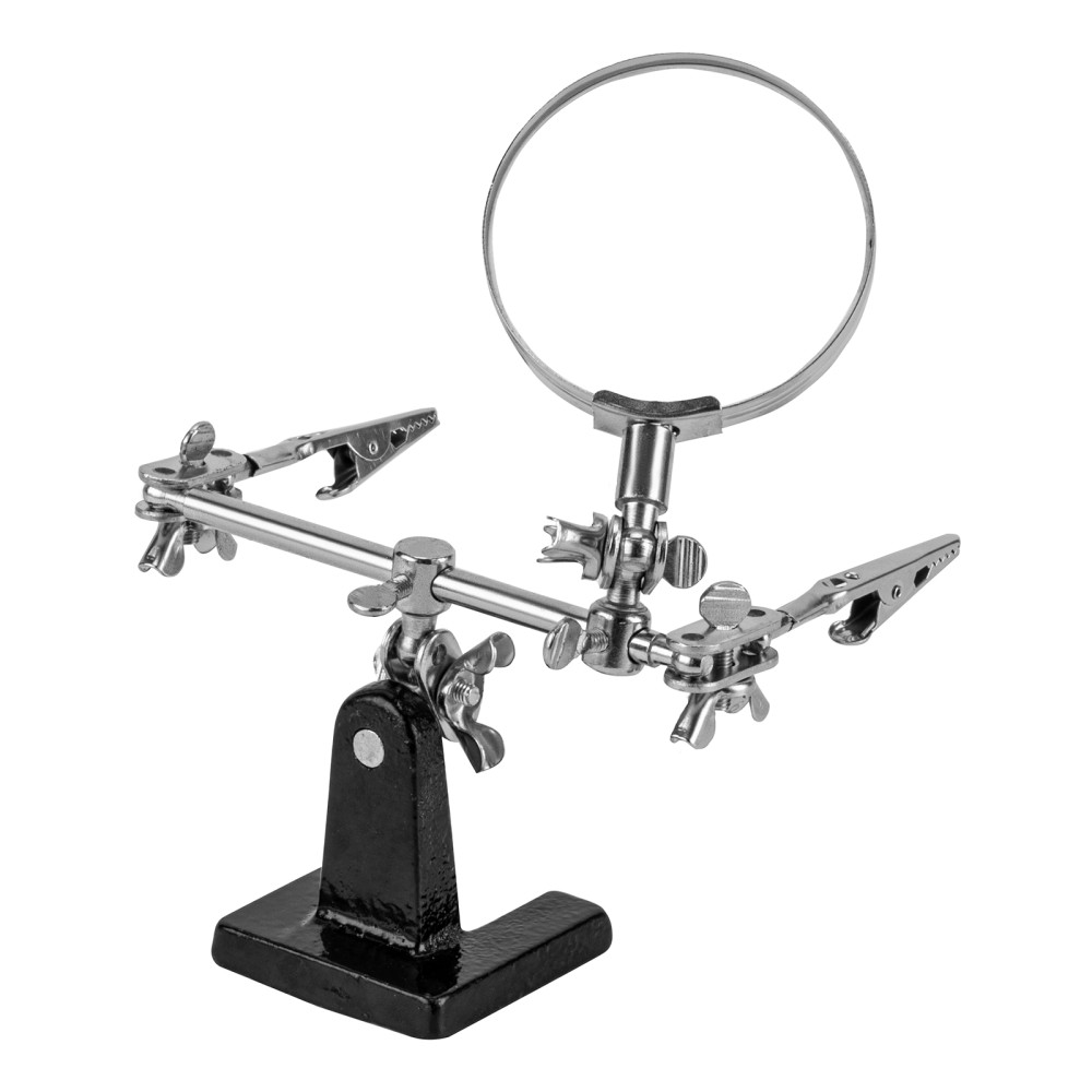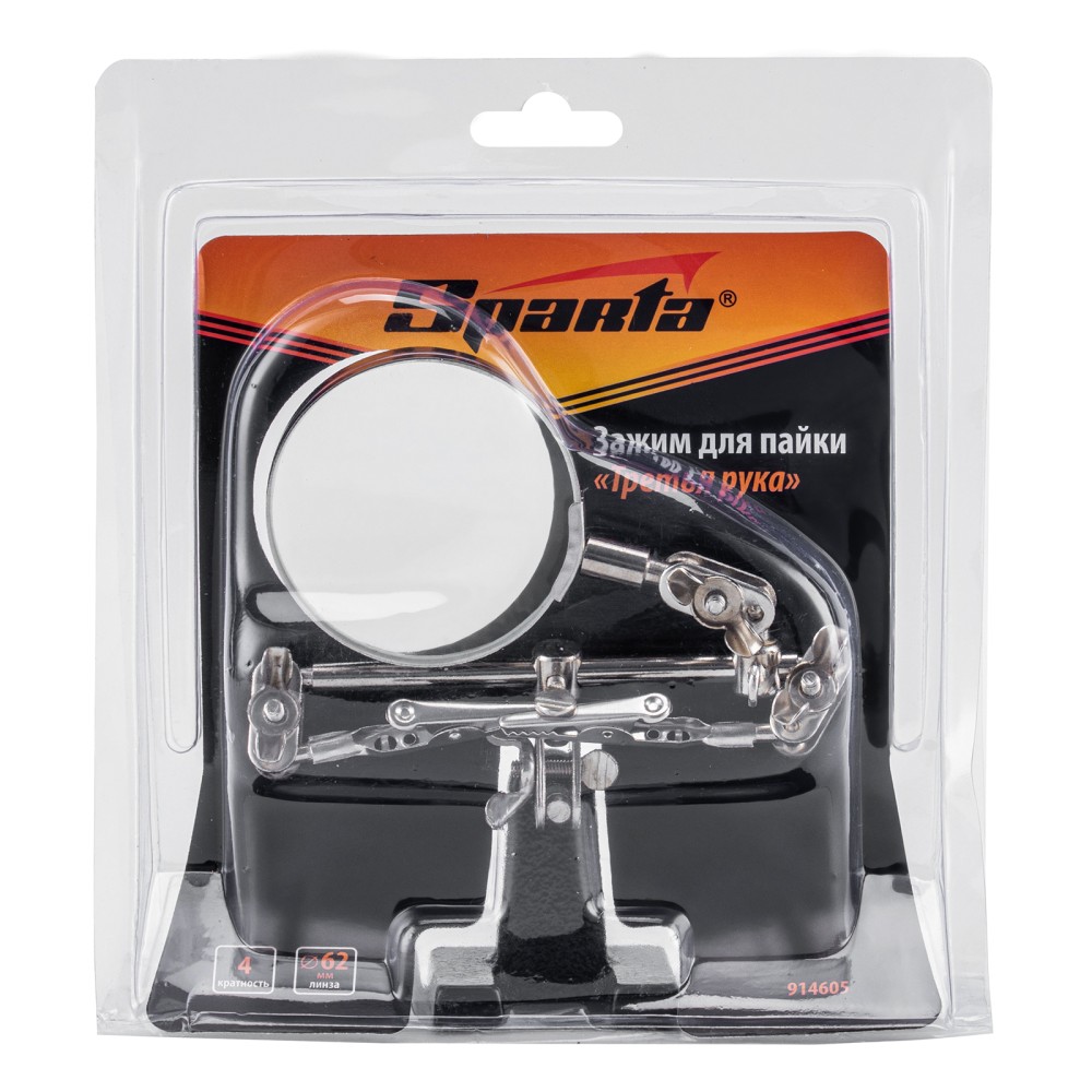 Зажим для пайки Sparta «Третья рука» 914605 предназначен для надежной фиксации плат, проводов и мелких деталей при пайке. Лупа с 4-кратным увеличением позволяет проводить микропайку с высокой точностью. Зажим будет полезен электрикам, мастерам по ремонту техники, а также пригодится в бытовой сфере.ПреимуществаУдобная эксплуатация — устойчивая станина исключает опрокидывание, крепкие «крокодилы» надежно удерживают детали.Фиксация предметов под различными углами — благодаря шарнирным креплениям зажимы и лупу можно установить в любом удобном положении.Функциональность — лупу можно передвигать по штанге.Прочность и долговечность — зажим изготовлен из стали с хромированным покрытием.